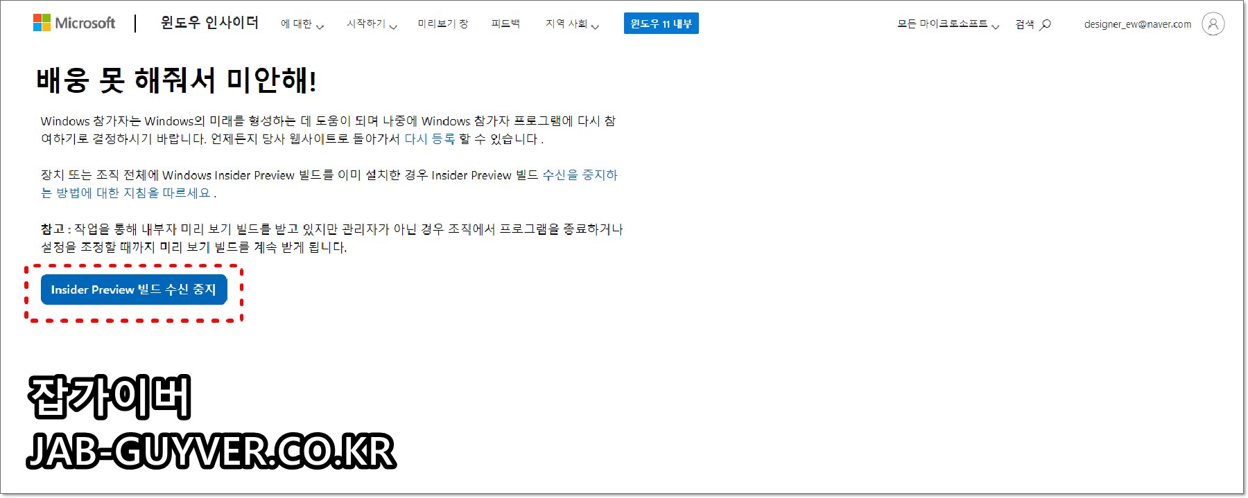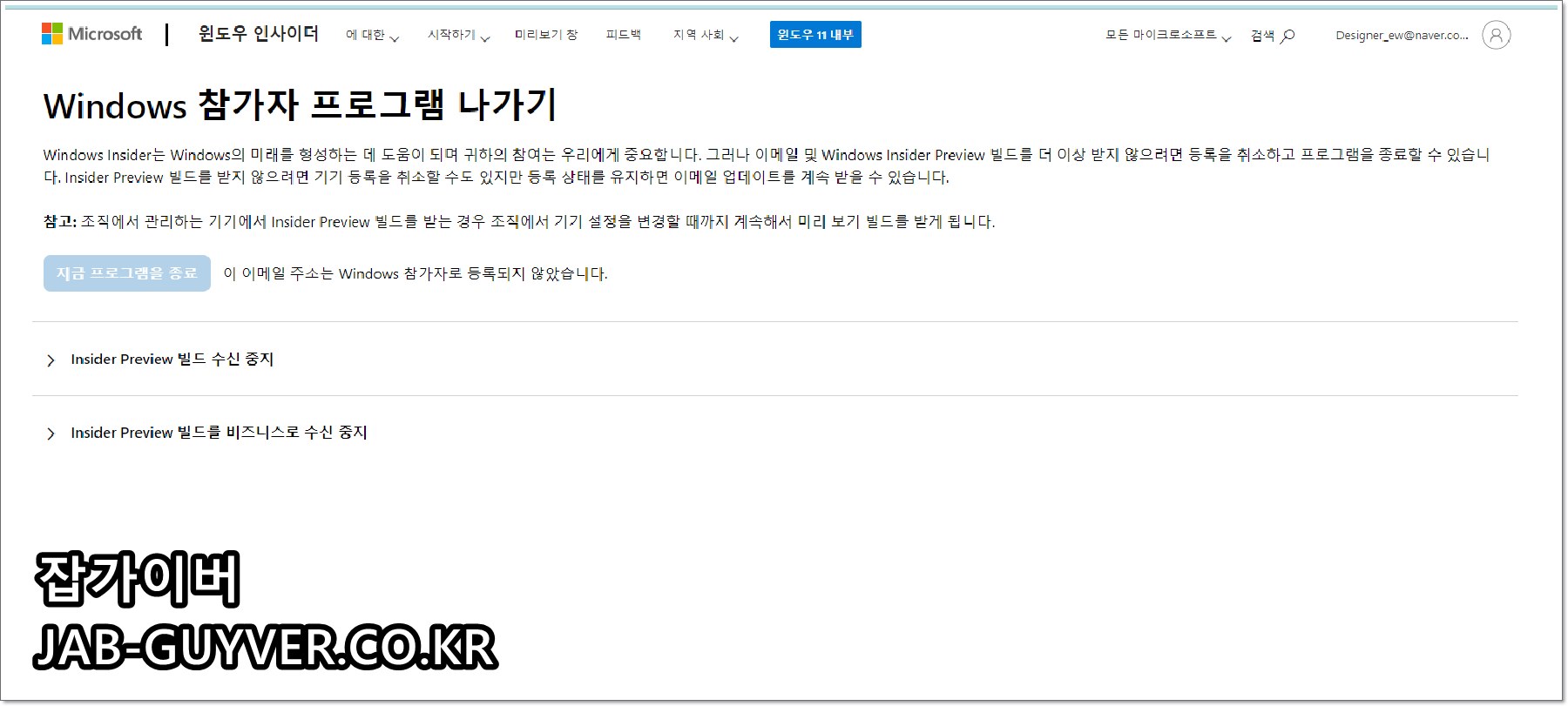 그럼 Winodws 참가자 프로그램 나가기 페이지로 접속되며 자신의 마이크로소프트 계정으로 로그인 후 Insider Preview 빌드 수신중지를 눌러주면 더 이상 Winodws 참가자 프로그램 사용이 중단됩니다.