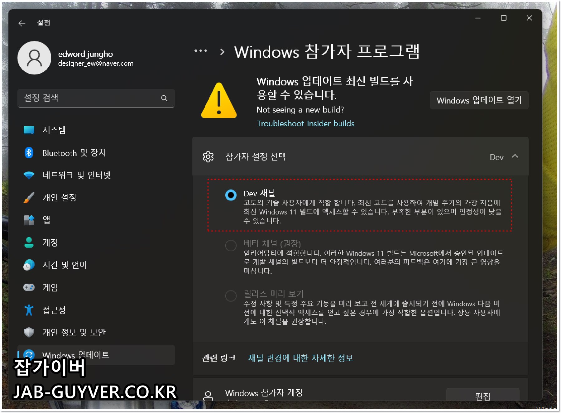 그럼 현재 사용하고 있는 참가자 설정을 DEV, 베타채널, 릴리스 미리보기 중 선택할 수 있으며 참자가 프로그램을 해제하고 싶다면 미리보기 빌드받기 중지를 선택합니다.