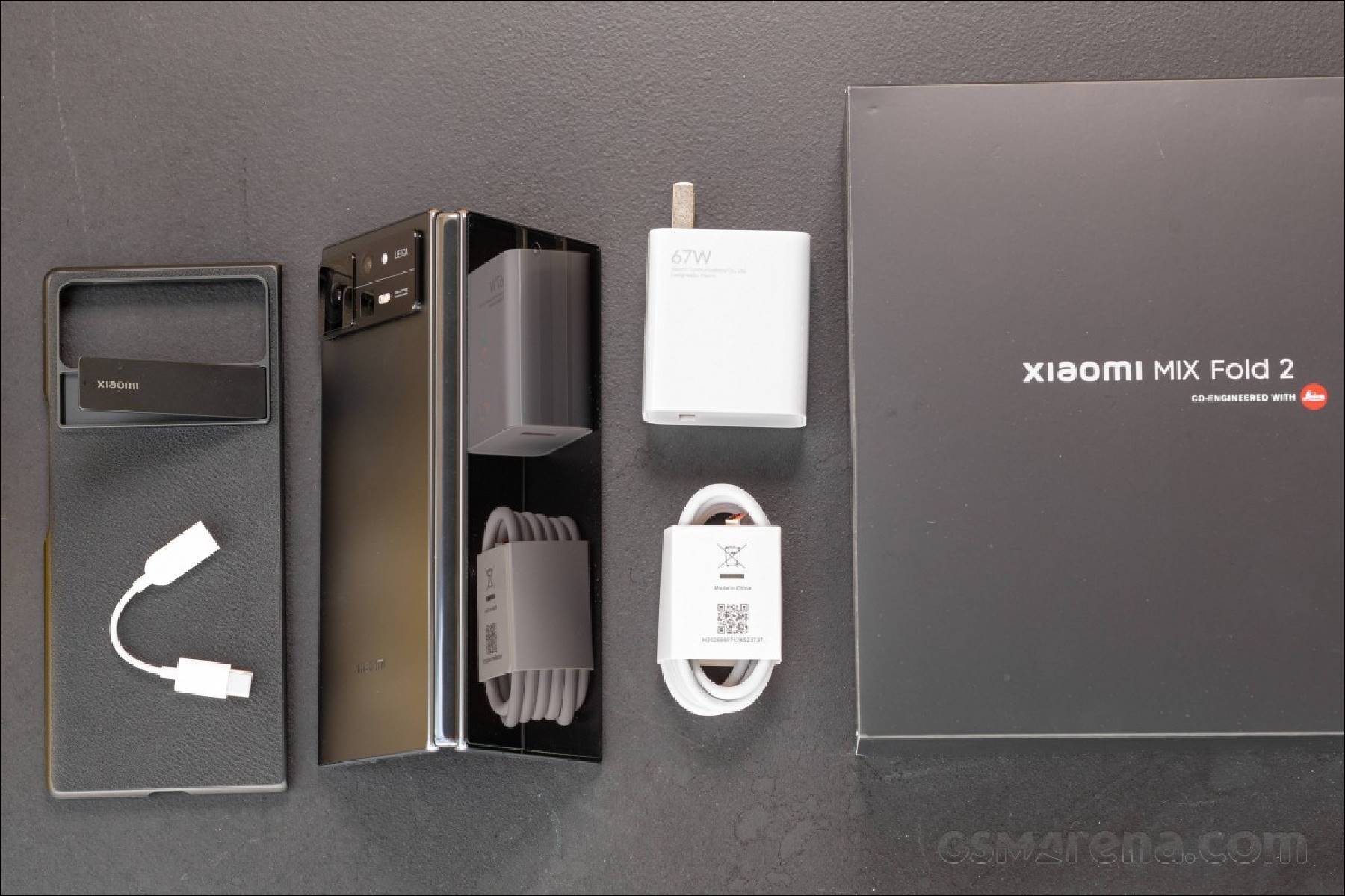 실제로 Xiaomi Mix Fold2는 독점 67W 충전기와 고속 충전이 작동하는 데 필요한 6A 등급 케이블이 포함된 대형 블랙박스에 들어 있으며 상자 안에 USB-C-to-3.5mm 어댑터도 있으므로 좋아하는 유선 헤드폰을 계속 사용할 수 있습니다. 그리고 조절 가능한 스탠드가 있는 특별한 가죽 케이스가 있습니다.