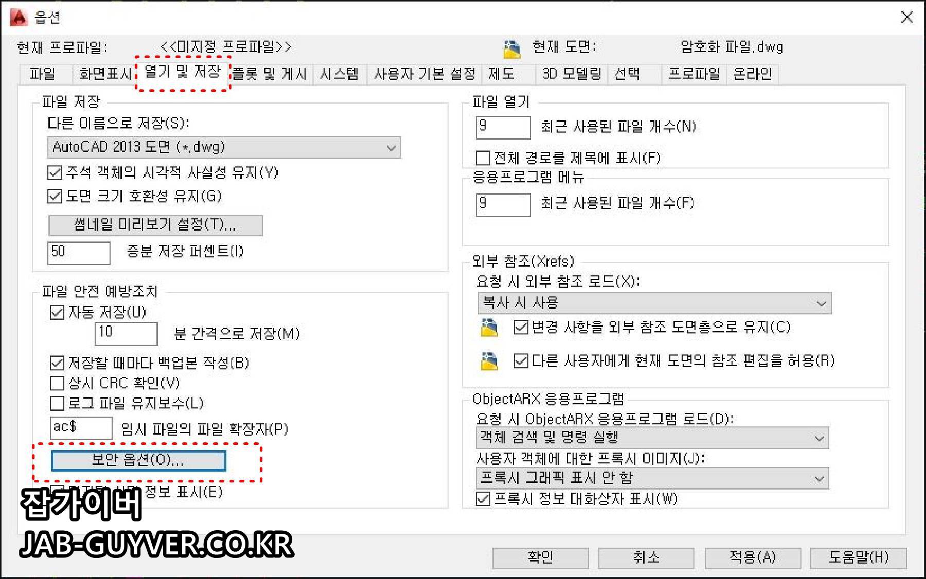 오토캐드 옵션이 실행되면 열기 및 저장 -> 보안 옵션을 통해 오토캐드 암호설정이 가능합니다.