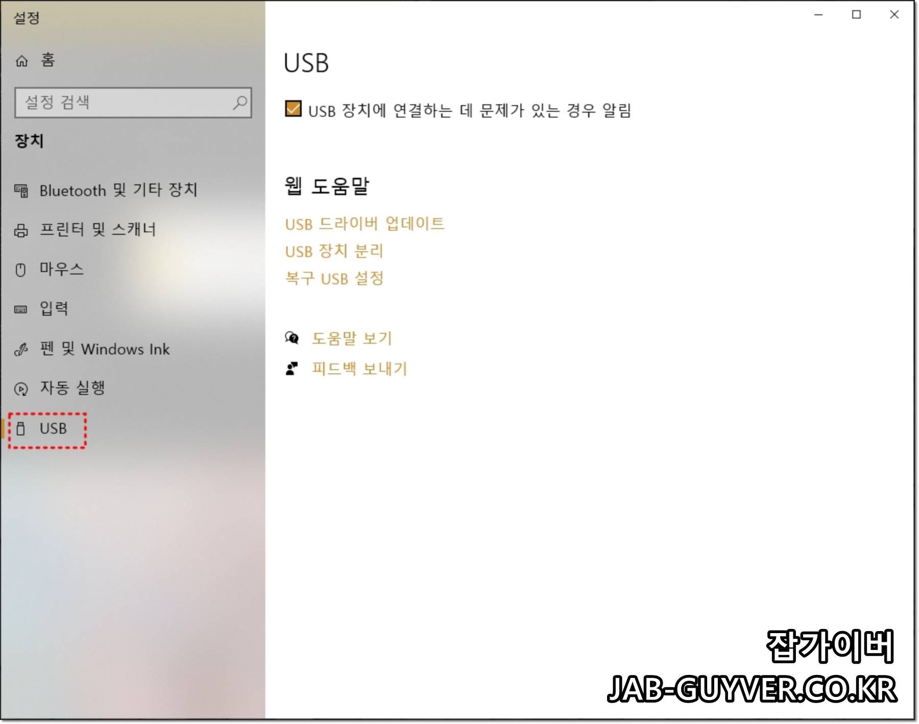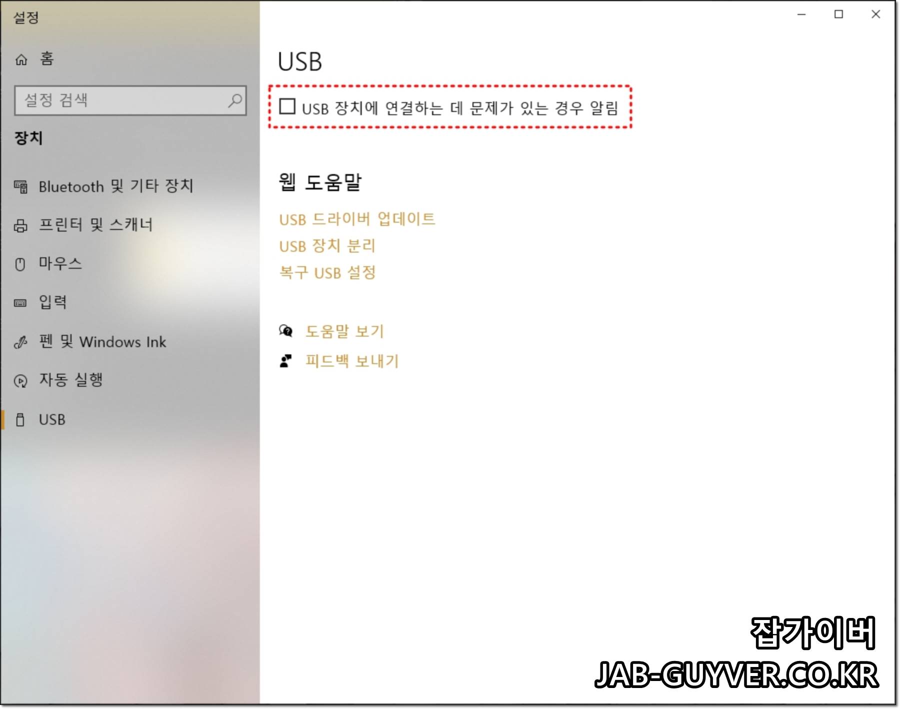 USB 장치에 연결하는 데 문제가 있는 경우 알림을 체크해제하면 더 이상 핸드폰 연결실패로 인한 알림창이 뜨지 않습니다.