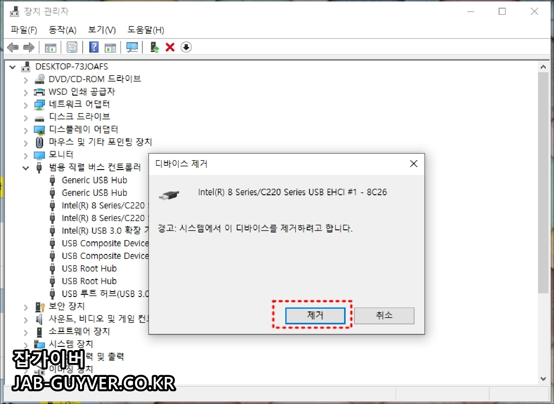 문제를 일으키는 현재 USB 장치를 선택 후 마우스 오른쪽 버튼으로 클릭하고 "장치 제거"를 선택해 제거를 선택합니다.