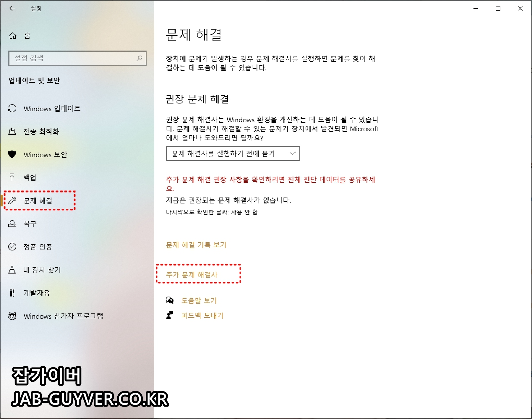 Win + I 눌러 Windows 설정 패널을 열고 "업데이트 및 보안" > "문제해결"으로 이동합니다.