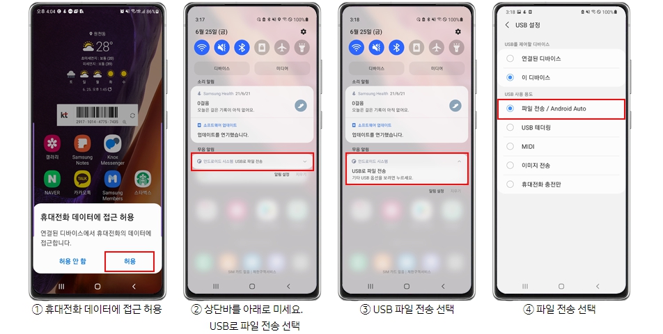 - 안드로이드 핸드폰의 경우 "미디어 기기(MTP)"로 연결 후 위 방법으로 시도할 수 있으며 USB 컴퓨터 연결 옵션에서 PTP로 변경 후 다시 MTP로 설정합니다.