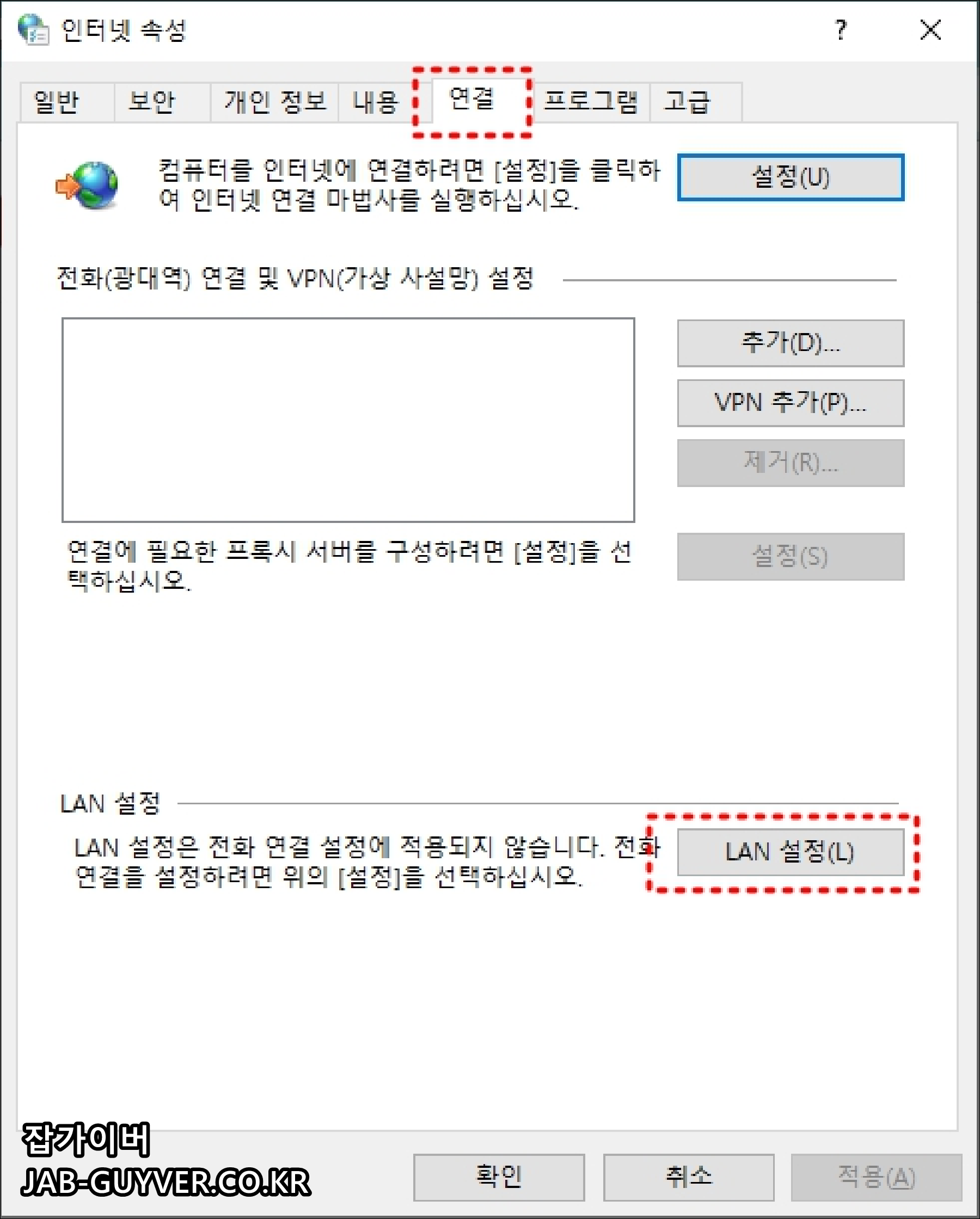 - 인터넷 속성 대화 상자의 연결 탭에서 LAN 설정을 클릭합니다.