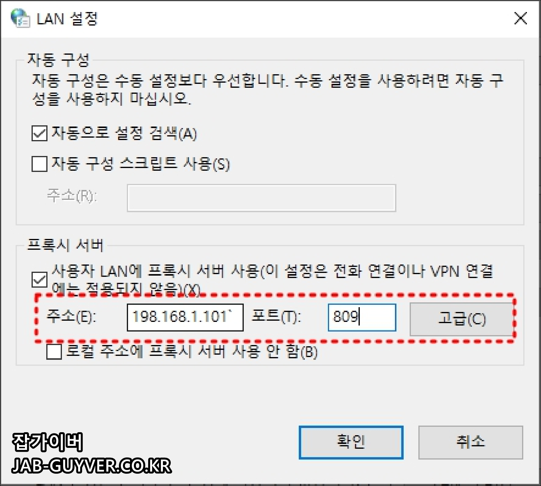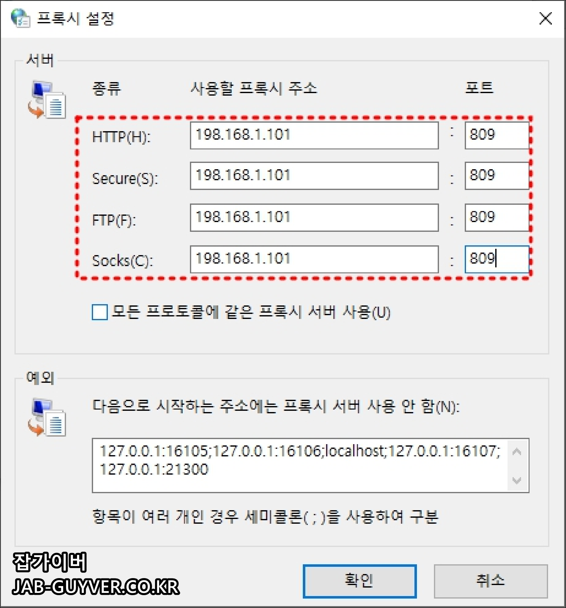 - 프록시 설정 대화 상자의 예외에서 아래값을 입력합니다.