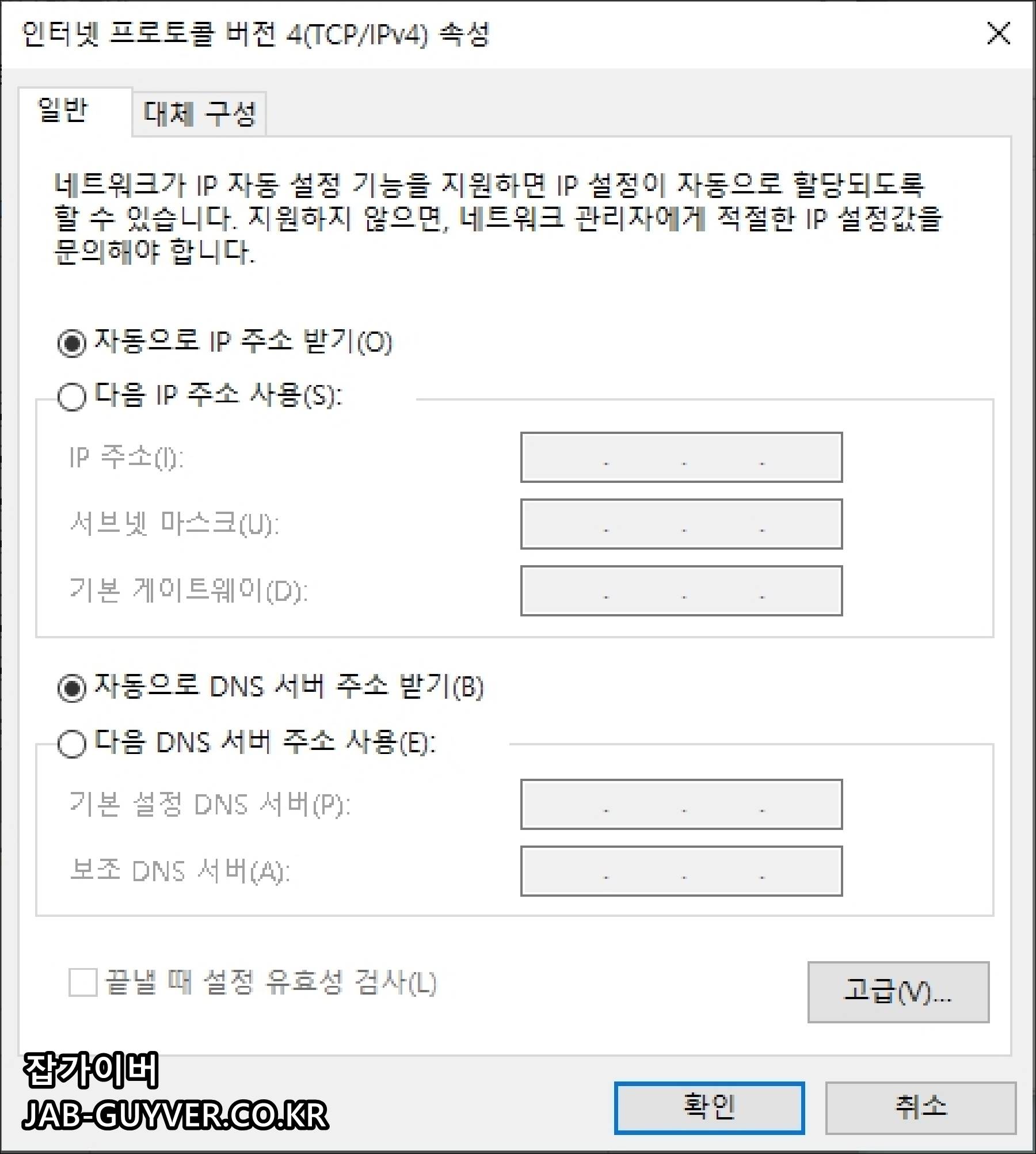 자동으로 ip주소 받기에서 다음 ip주소 사용으로 선택하면 수동으로 고정IP주소 변경할 수 있습니다.