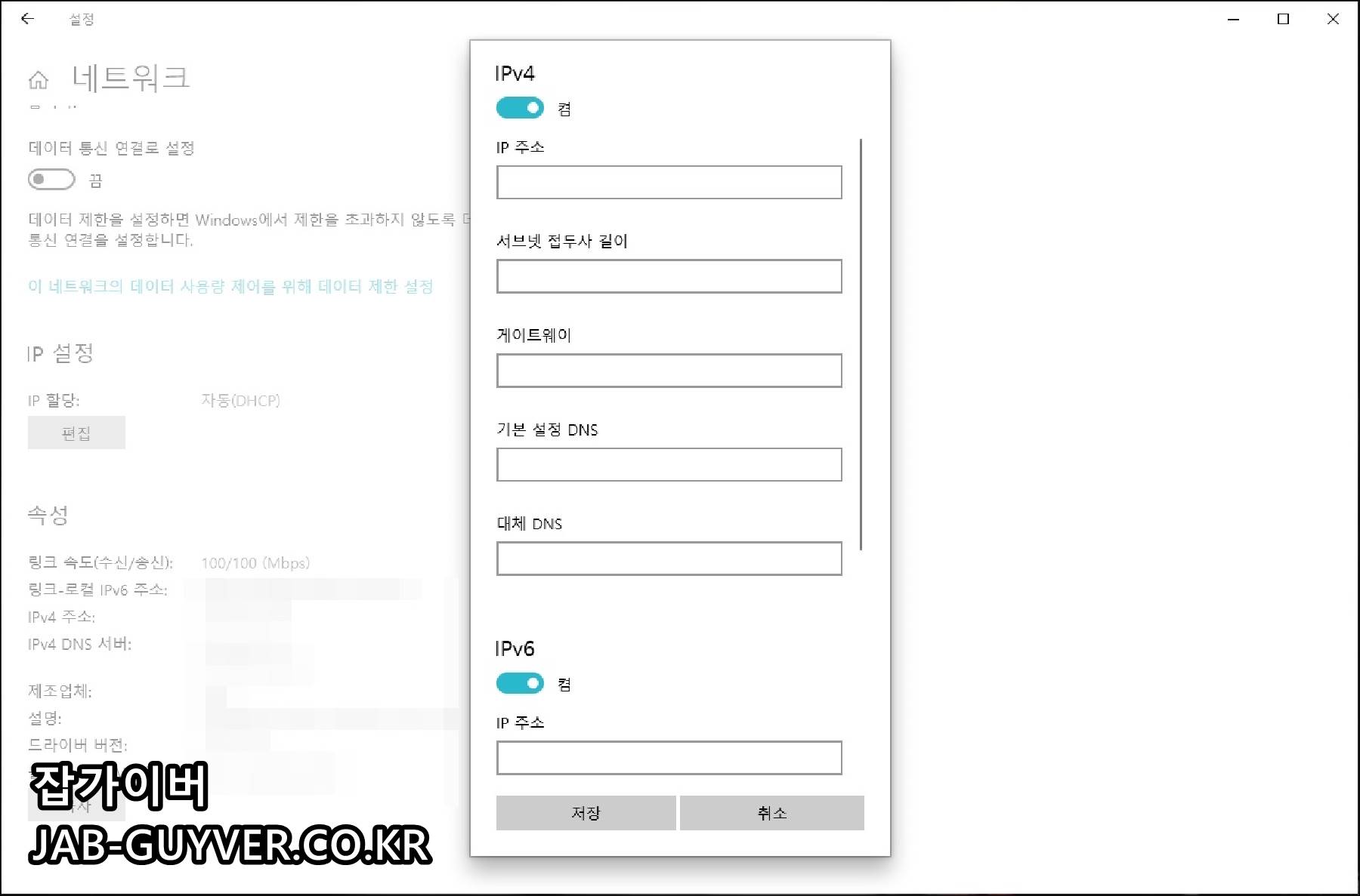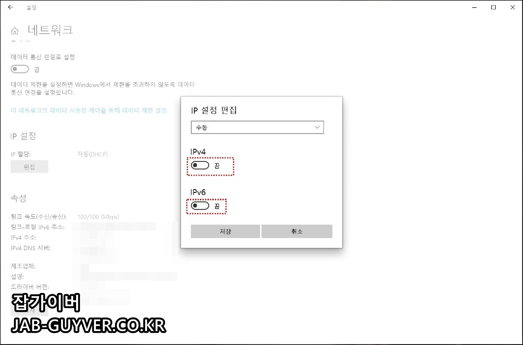 인터넷 연결 시 IPv4 및 IPv6 주소가 꺼져 있으며 모두 활성화해줍니다.