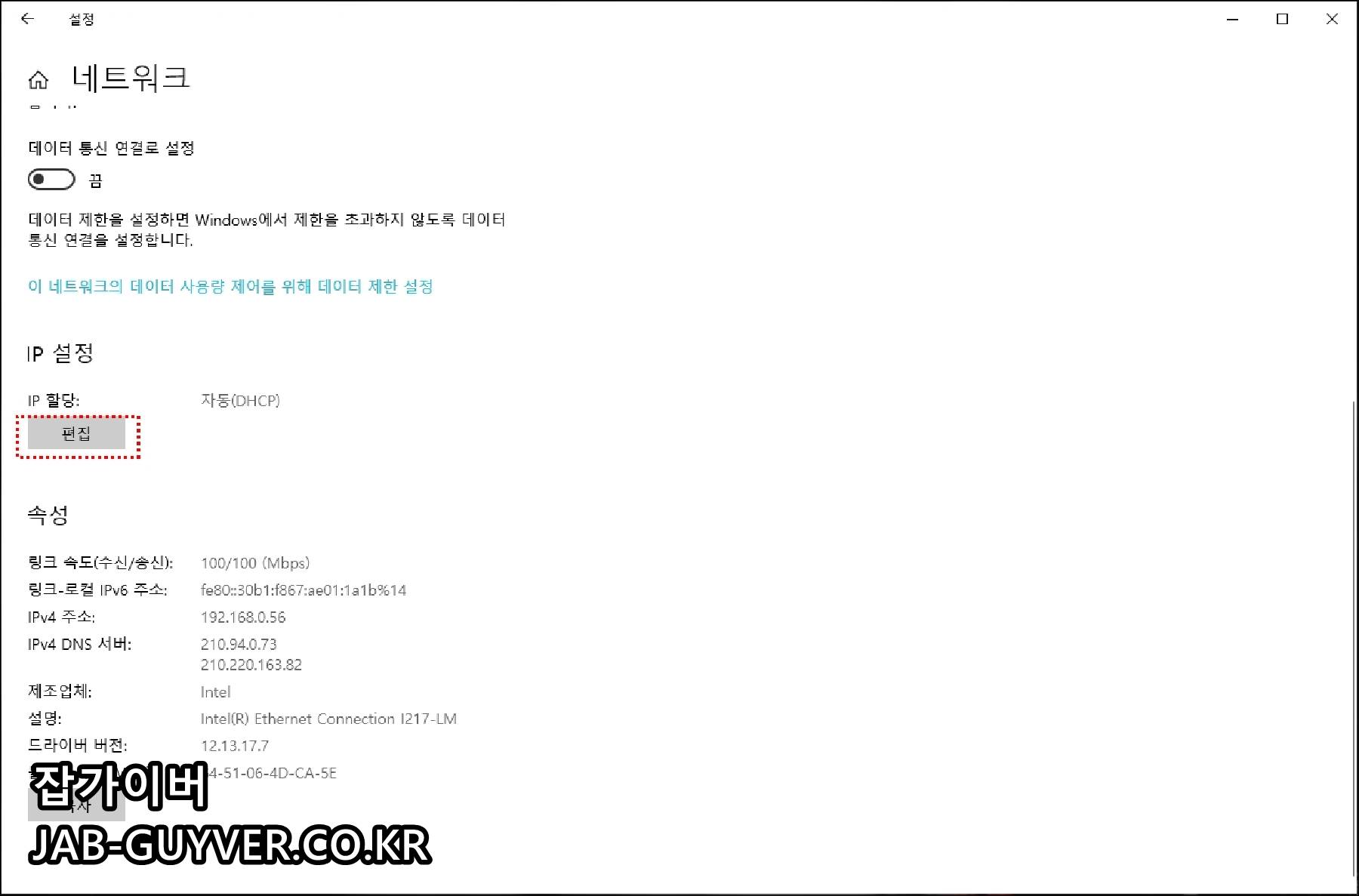 ip설정 -> ip할당이 자동으로 되어 있는데 편집으로 들어갑니다.