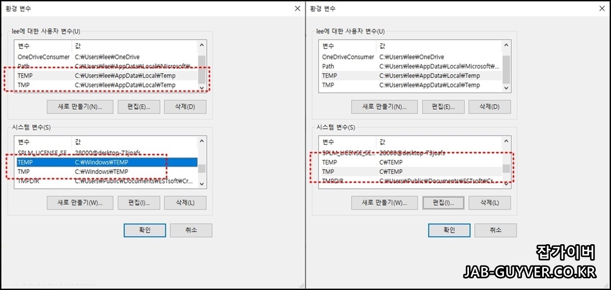 이렇게 한글 User Name이 설정은 추후 윈도우 환경변수에서 Temp와 Tmp 경로를 확인 후 기본 설정값으로 변경해줍니다.