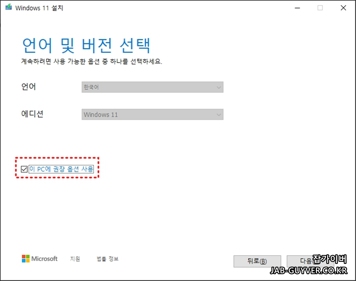 만약 영어 및 중국어 일본어등 다른 언어로 변경하고 싶다면 "이 PC에 권장옵션 사용"을 체크해제 해서 원하는 언어로 변경합니다.