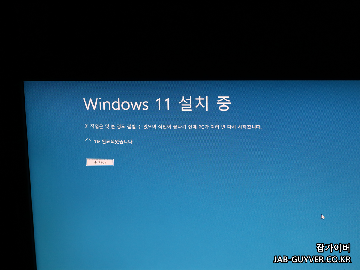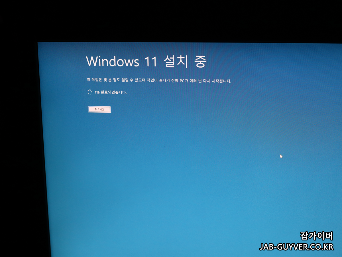 다음을 누르면 자동으로 윈도우11 설치가 진행되며 이후 자동으로 컴퓨터가 재부팅 되는데 재부팅 시 윈도우11 USB 부팅디스크가 삽입되어 있다면 설치가 계속 진행되지 않고 윈도우 초기설치 화면으로 부팅되기 때문에 설치 중 재부팅이 되기 전 윈도우 부팅 USB를 해제합니다.