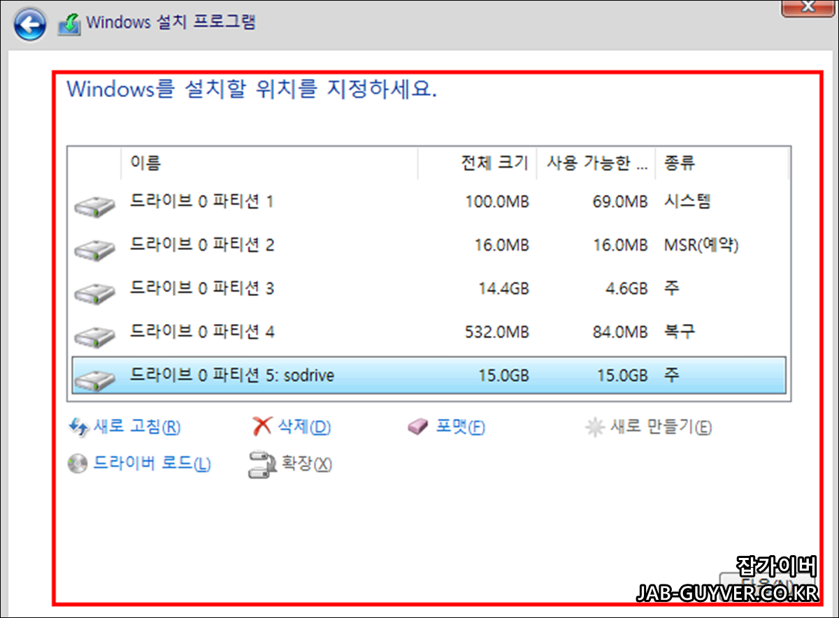 설치를 위해서는 해당 드라이브 파티션이 시스템이나 MSR 예약 파티션이 아닌 주 파티션에서만 설치가 가능합니다.