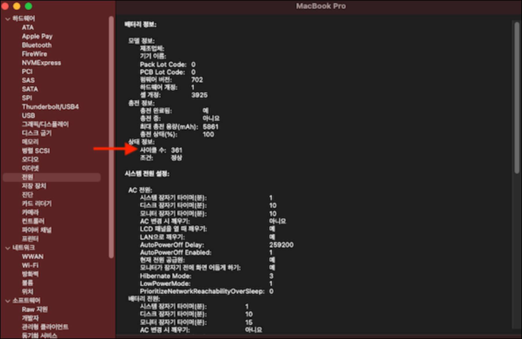 | 배터리 사이클 확인 | Apple 메뉴 → Option 누른 상태에서 시스템 정보 → 전원 | 사이클 수, 상태 확인 | 1000회 이상이면 성능 저하 시작, 교체 시점 판단 |