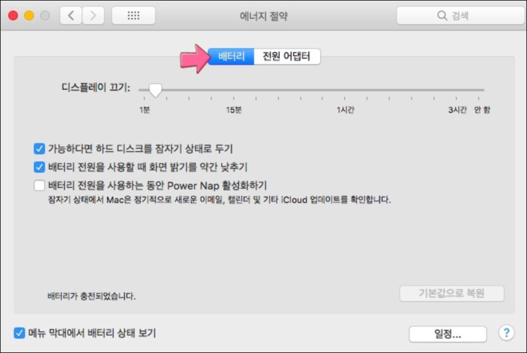 | Power Nap 설정 | 시스템 설정 → 배터리 → 배터리 탭 | Power Nap 활성화 또는 비활성화 | 필요 시에만 켜두는 게 좋음 |