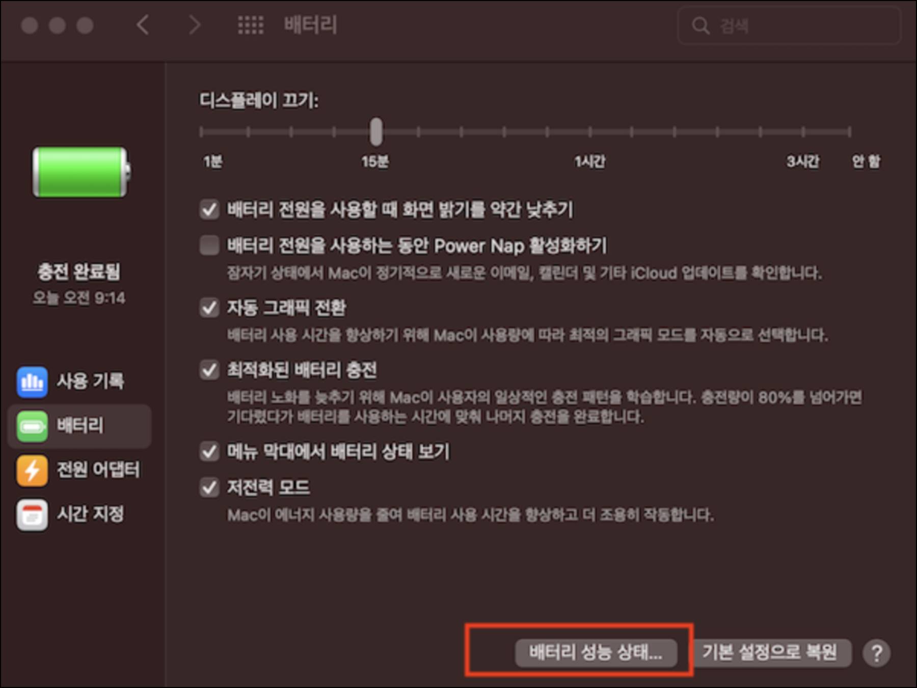 | 디스플레이 끄기 시간 조정 | 시스템 설정 → 배터리 → 배터리/전원 어댑터 탭 | xx분 후 디스플레이 끄기 | 사용하지 않을 때 자동으로 화면 꺼지게 설정 |