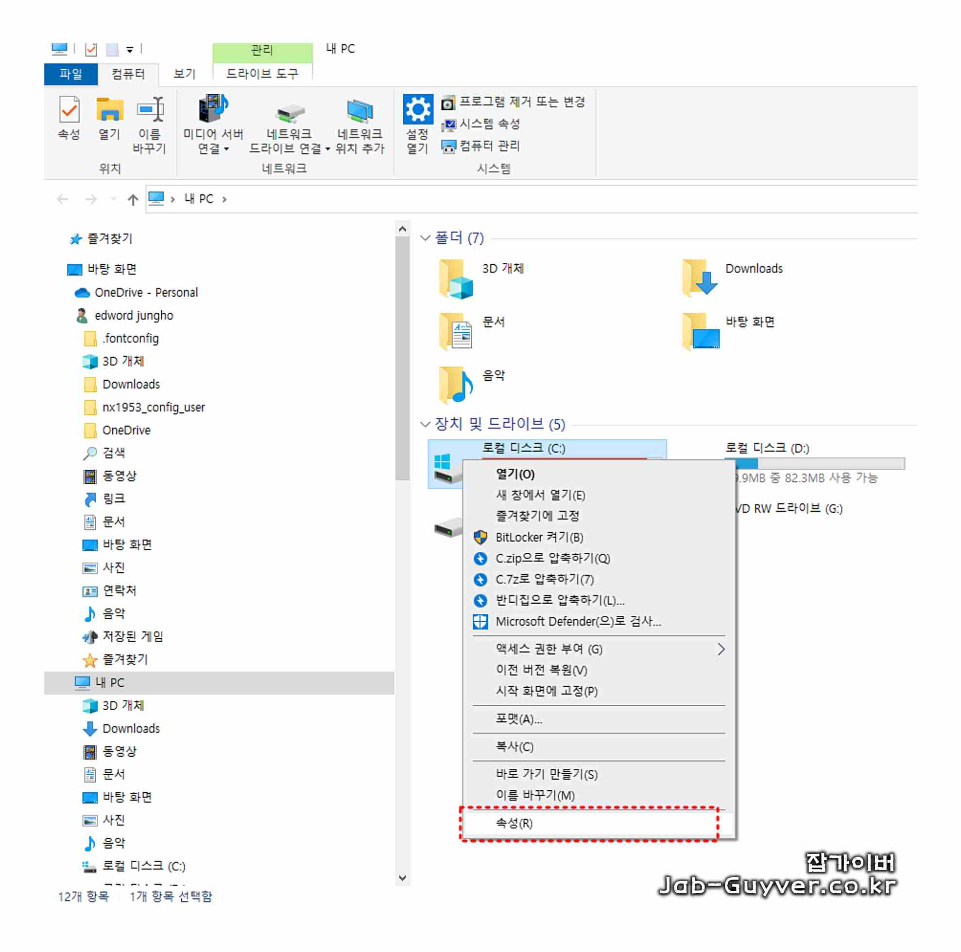 - 이 드라이브를 압축하여 디스크 공간 절약