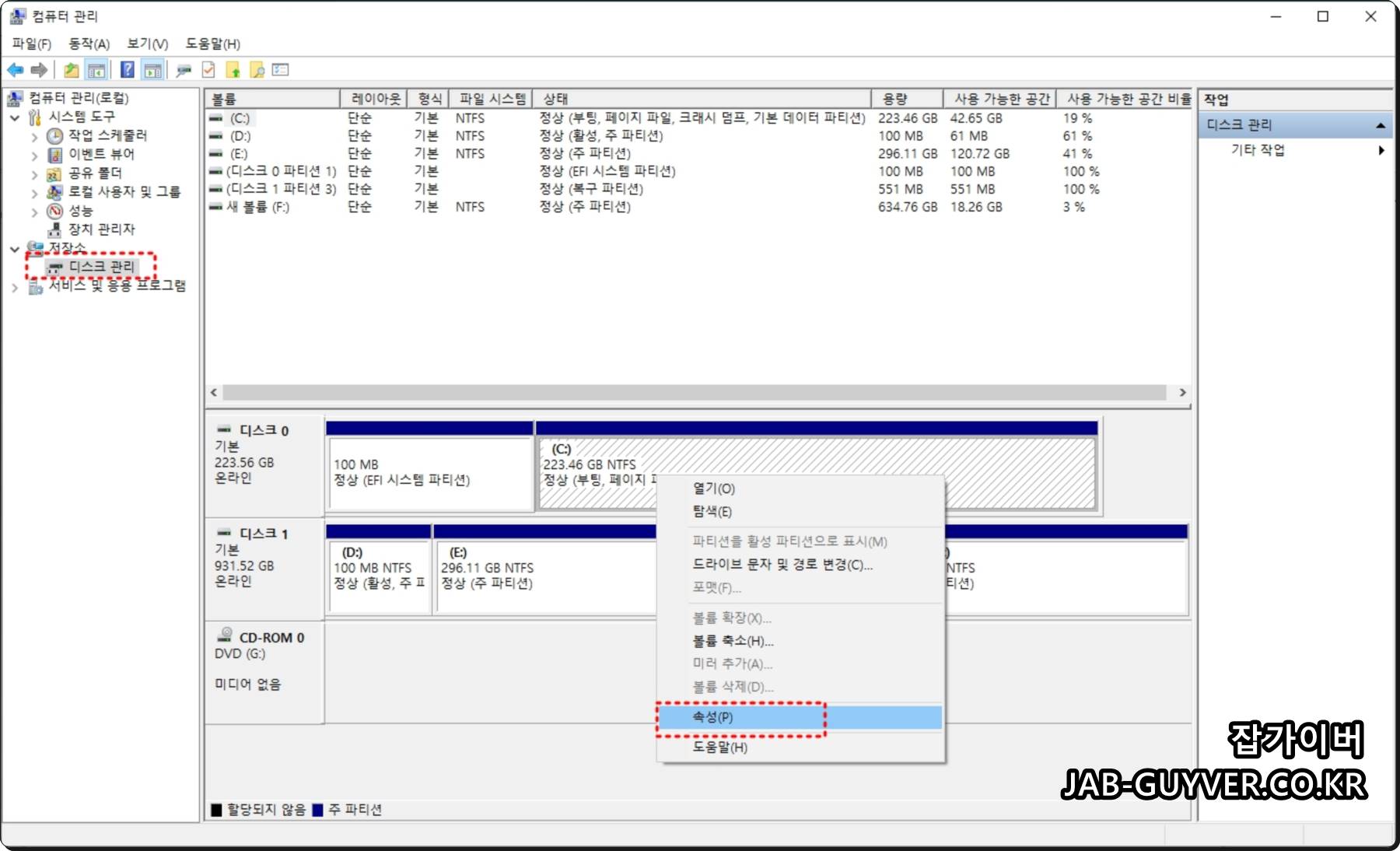 저장소 -> 디스크관리로 들어갑니다.