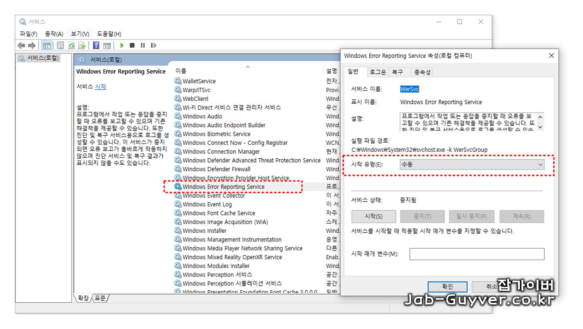 "Windows Error Reporting Service"를 찾고 이를 우클릭하여 "속성"을 선