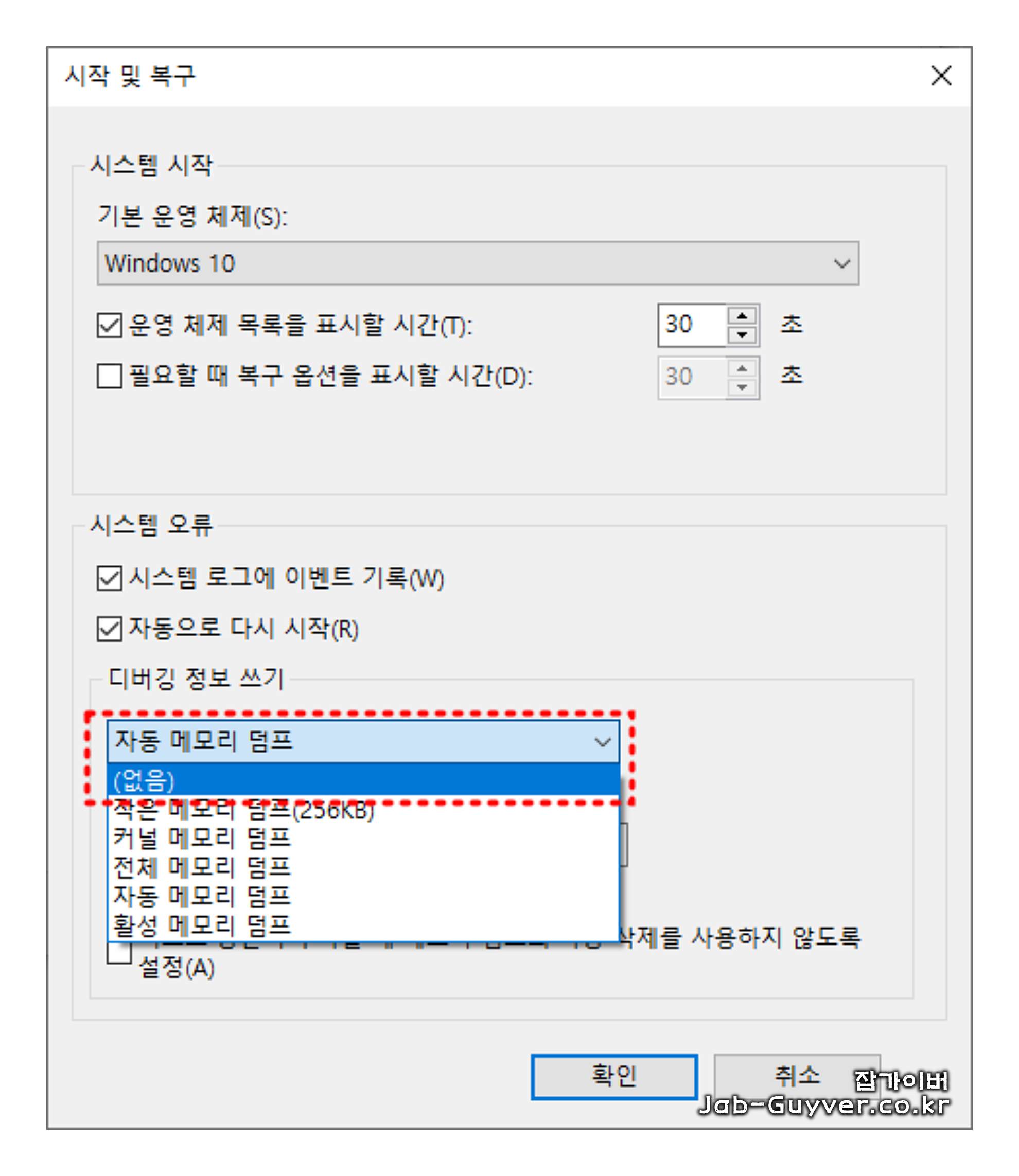그럼 디버깅 정보 쓰기가 자동 메모리 덤프로 설정되어 있습니다.