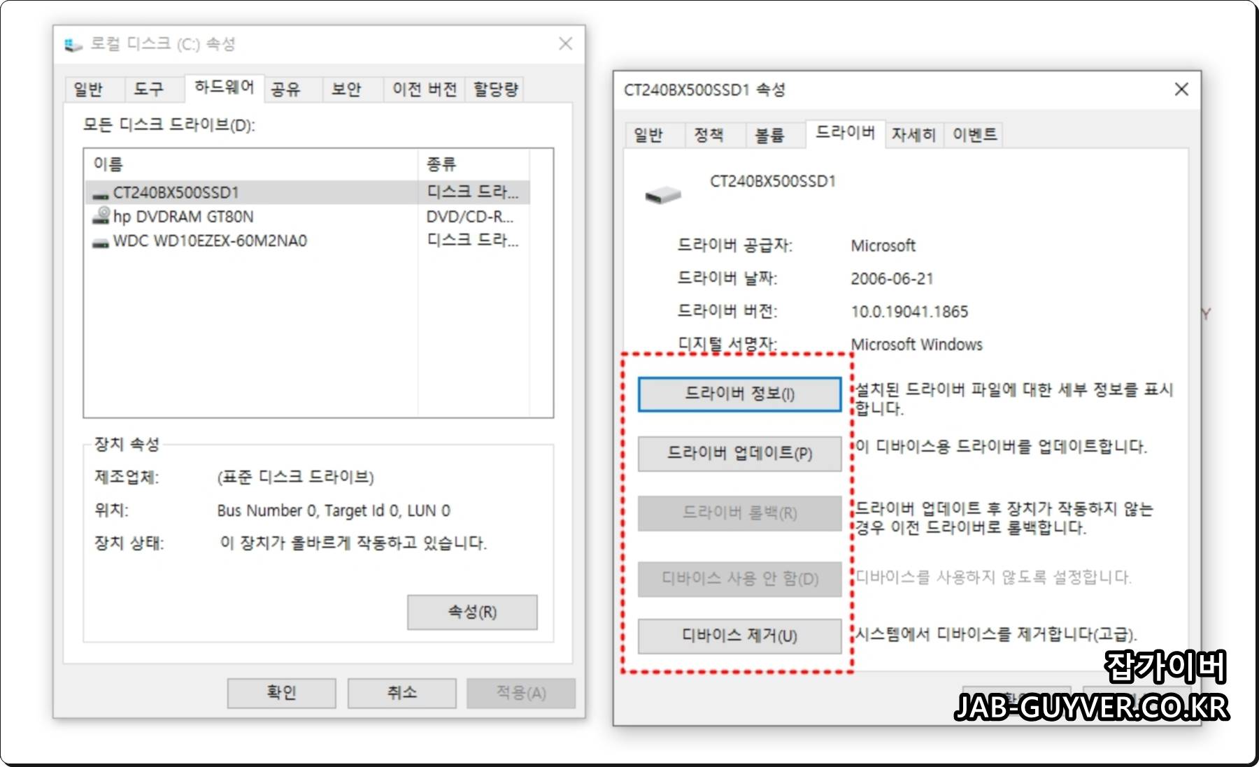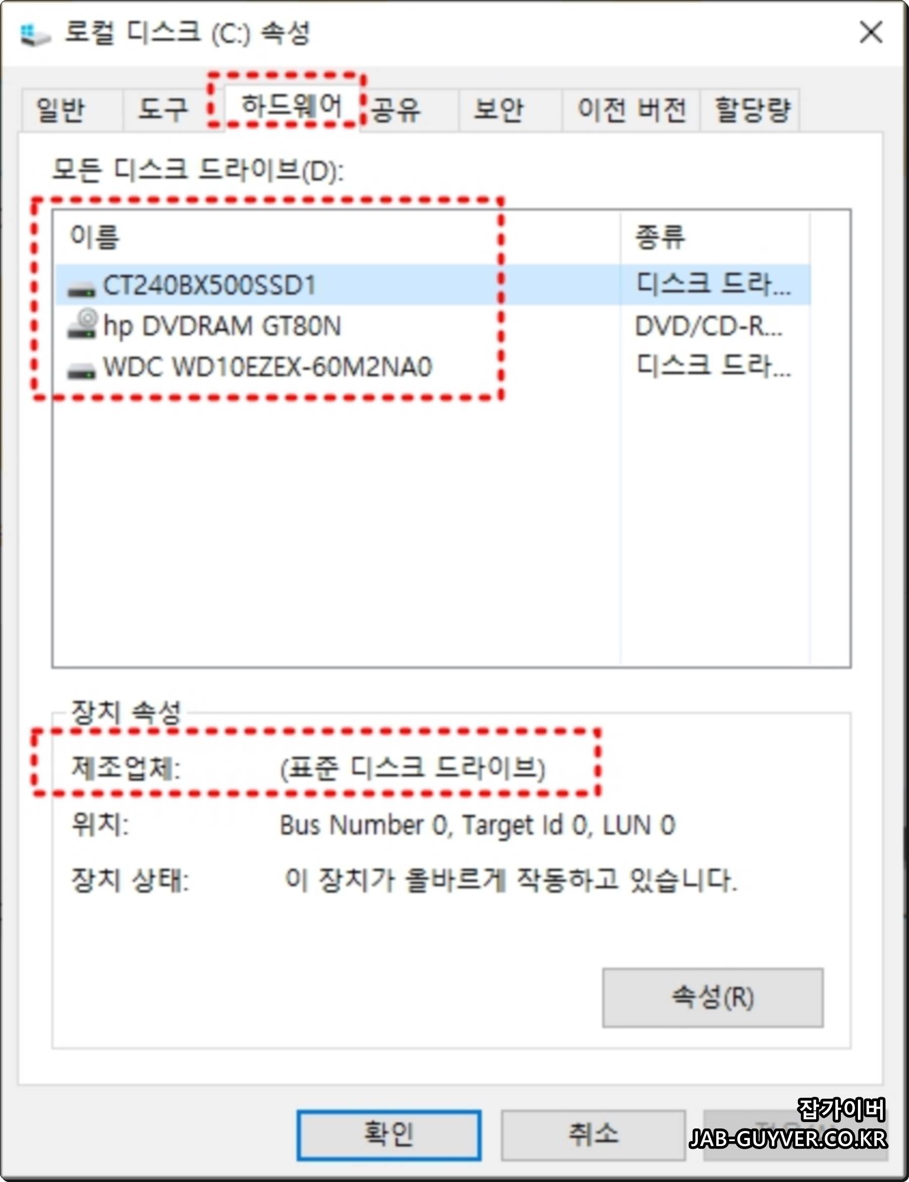 현재 장착 중인 하드디스크 및 SSD 제대로 인식되지 않거나 드라이버 업데이트를 하고 싶다면 하드웨어 -> 속성 -> 드라이버로 이동합니다.