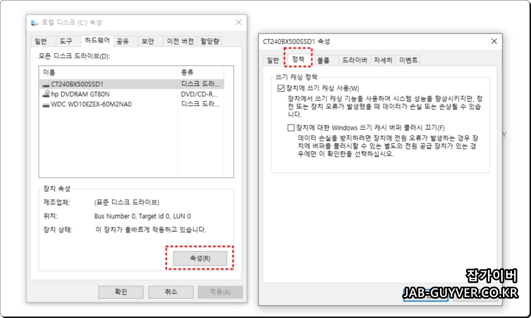 이렇게 SSD 및 HDD 종류를 확인했다면 속성 -> 정책으로 들어갑니다.