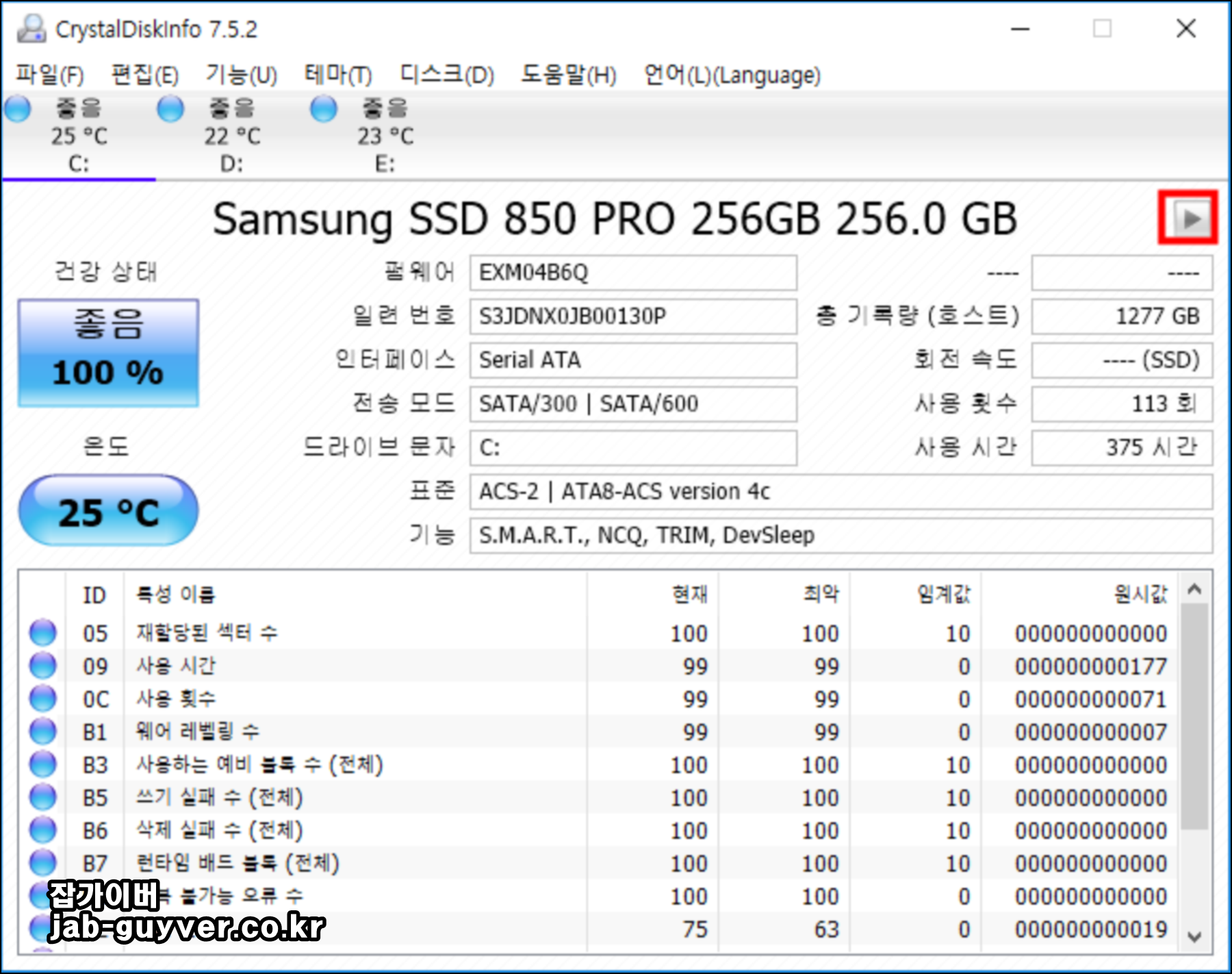 그 외에도 크리스탈디스크인포 프로그램을 사용하면 현재 장착된 디바이스가 SSD 및 하드디스크인지 뿐만 아니라 펌웨어 버전, 제품 일련번호, 인터페이스 종류, 전송모드 속도 (SATA 방식), SSD 기능 (S.M.A.R.T, NCQ, TRIM, DevSleep 등등과 현재 사용한 횟수 및 시간, 회전속도, 용량, 배드섹터, 용량, 온도 등을 확인할 수 있습니다.