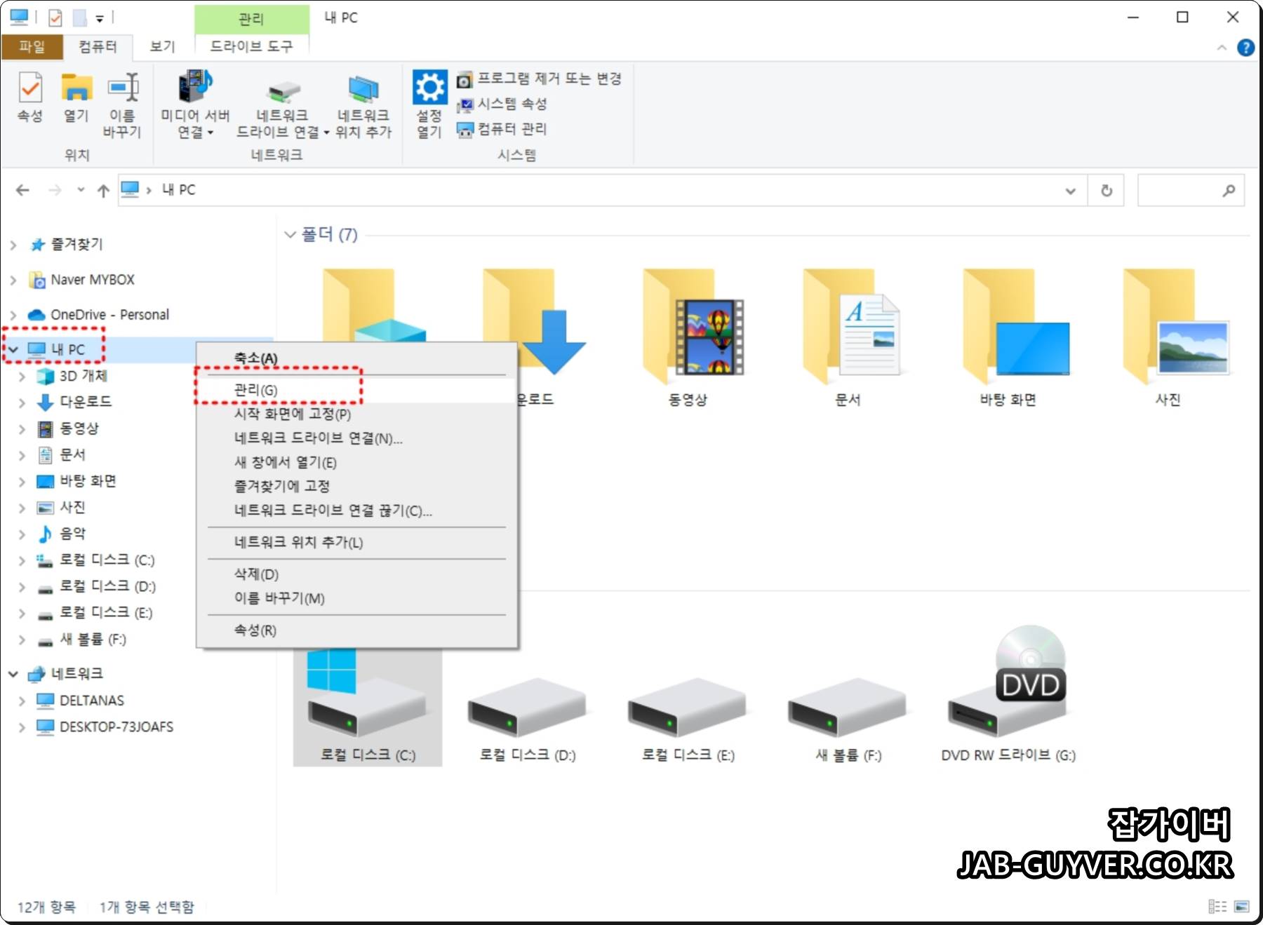 다른방법으로는 내PC -> 마우스 우클릭 관리로 들어갑니다.