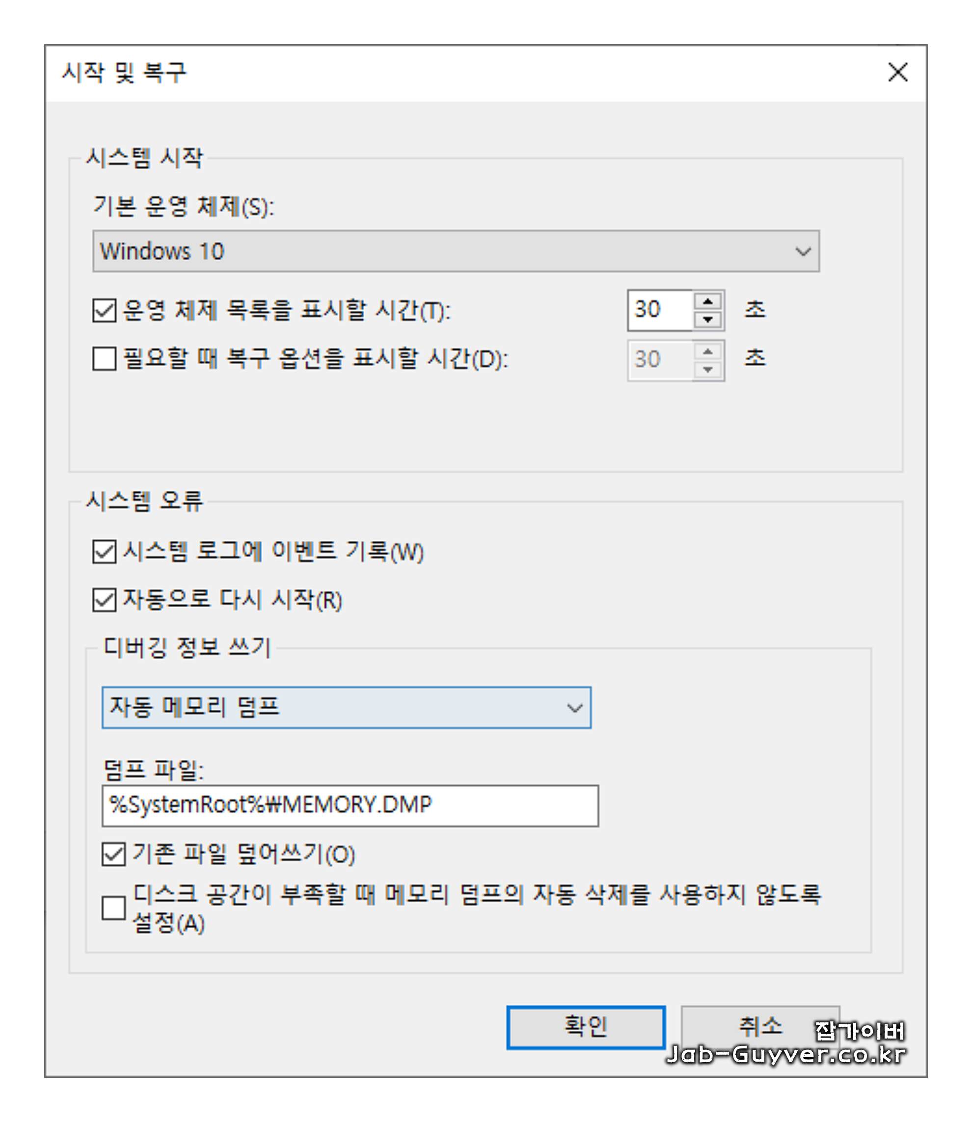블루스크린 발생 시 덤프 파일이 자동으로 생성됩니다. 이 파일이 많아지면 부팅 속도가 증가할 수 있습니다. 따라서 메모리 덤프를 비활성화하는 것이 좋습니다.