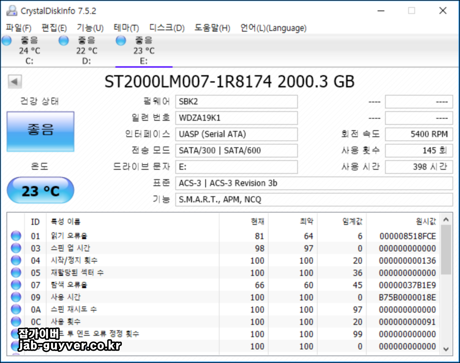 그 외에도 크리스탈디스크인포 프로그램을 사용하면 현재 장착된 디바이스가 SSD 및 하드디스크인지 뿐만 아니라 펌웨어 버전, 제품 일련번호, 인터페이스 종류, 전송모드 속도 (SATA 방식), SSD 기능 (S.M.A.R.T, NCQ, TRIM, DevSleep 등등과 현재 사용한 횟수 및 시간, 회전속도, 용량, 배드섹터, 용량, 온도 등을 확인할 수 있습니다.