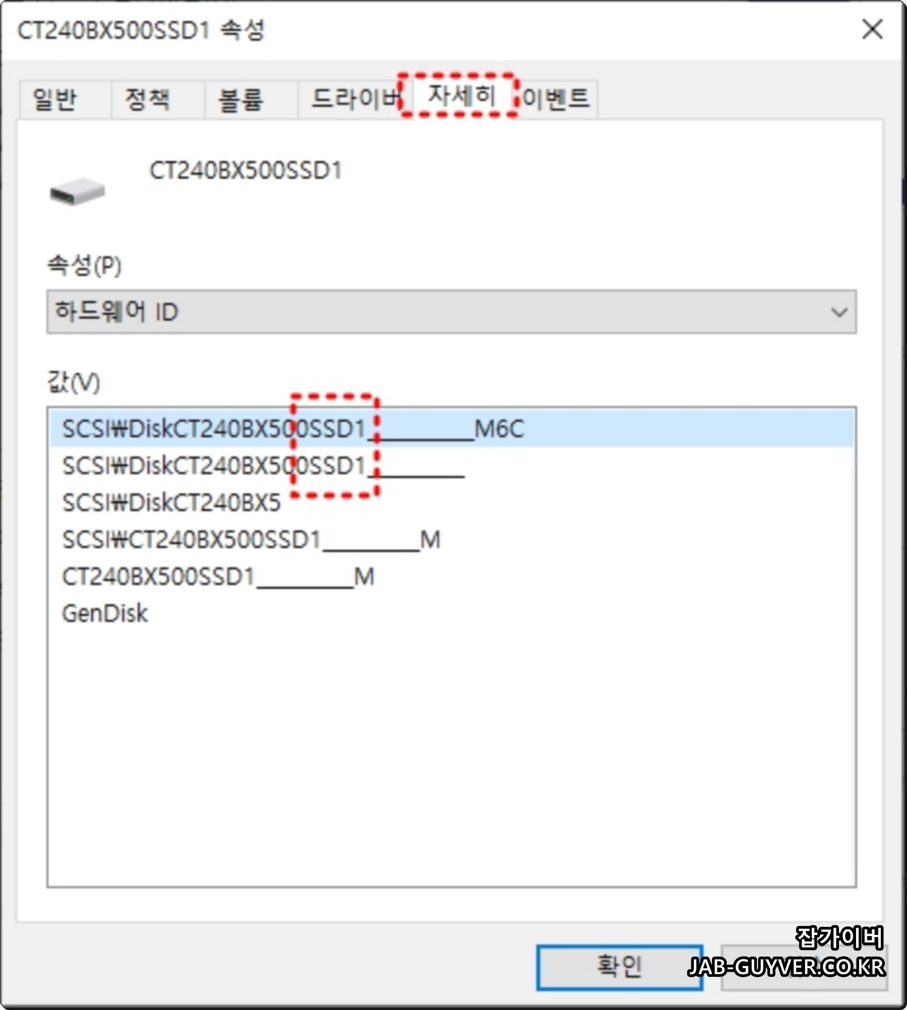 현재 장착 중인 하드디스크 및 SSD 제대로 인식되지 않거나 드라이버 업데이트를 하고 싶다면 하드웨어 -> 속성 -> 드라이버로 이동합니다.