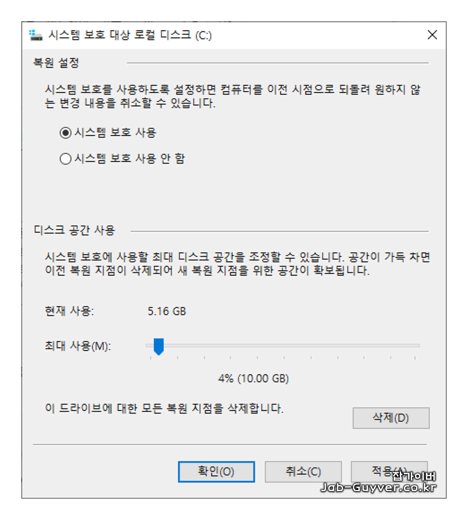 해당 드라이브를 선택하고 "설정"을 클릭한 다음 "시스템 보호 비활성화"를 선택하고 확인을 눌러줍니다.
