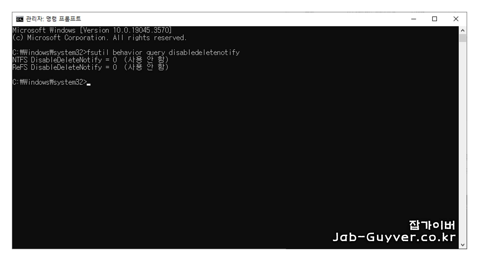 만약 값이 1이라면 "fsutil behavior query disabledeletenotify 0" 명령어를 실행하여 설정을 변경합니다.