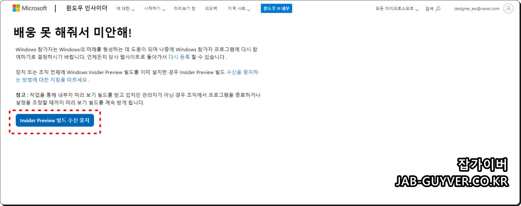 Insided Preivew 빌드수신 중지를 눌러줍니다.
