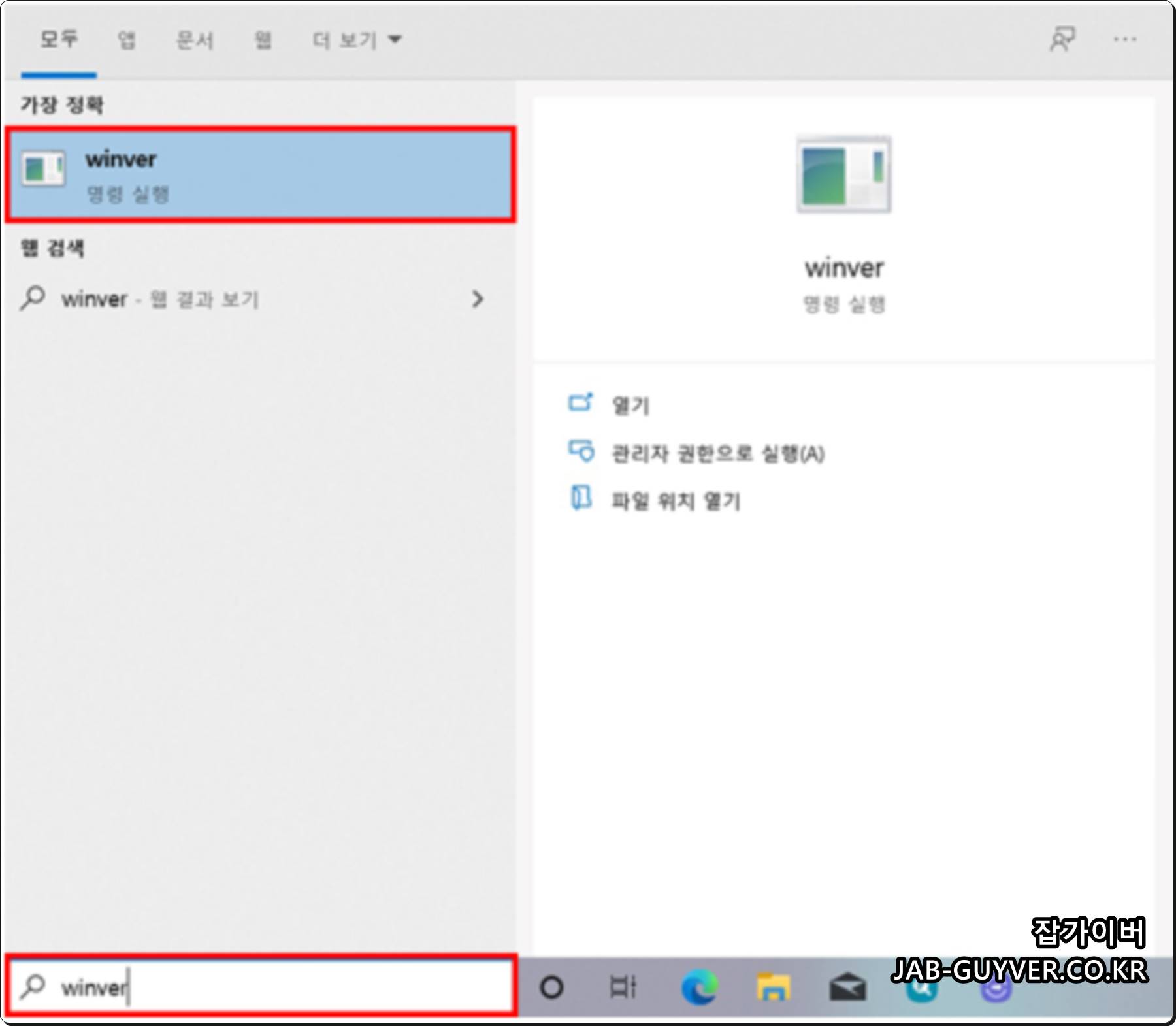 윈도우11에서 윈도우10 되돌아가기가 성공했다면 검색창에 Winver 입력 후 엔터를 눌러주면 현재 설치된 윈도우 버전이 윈도우10으로 복구가 된것을 볼 수 있습니다.