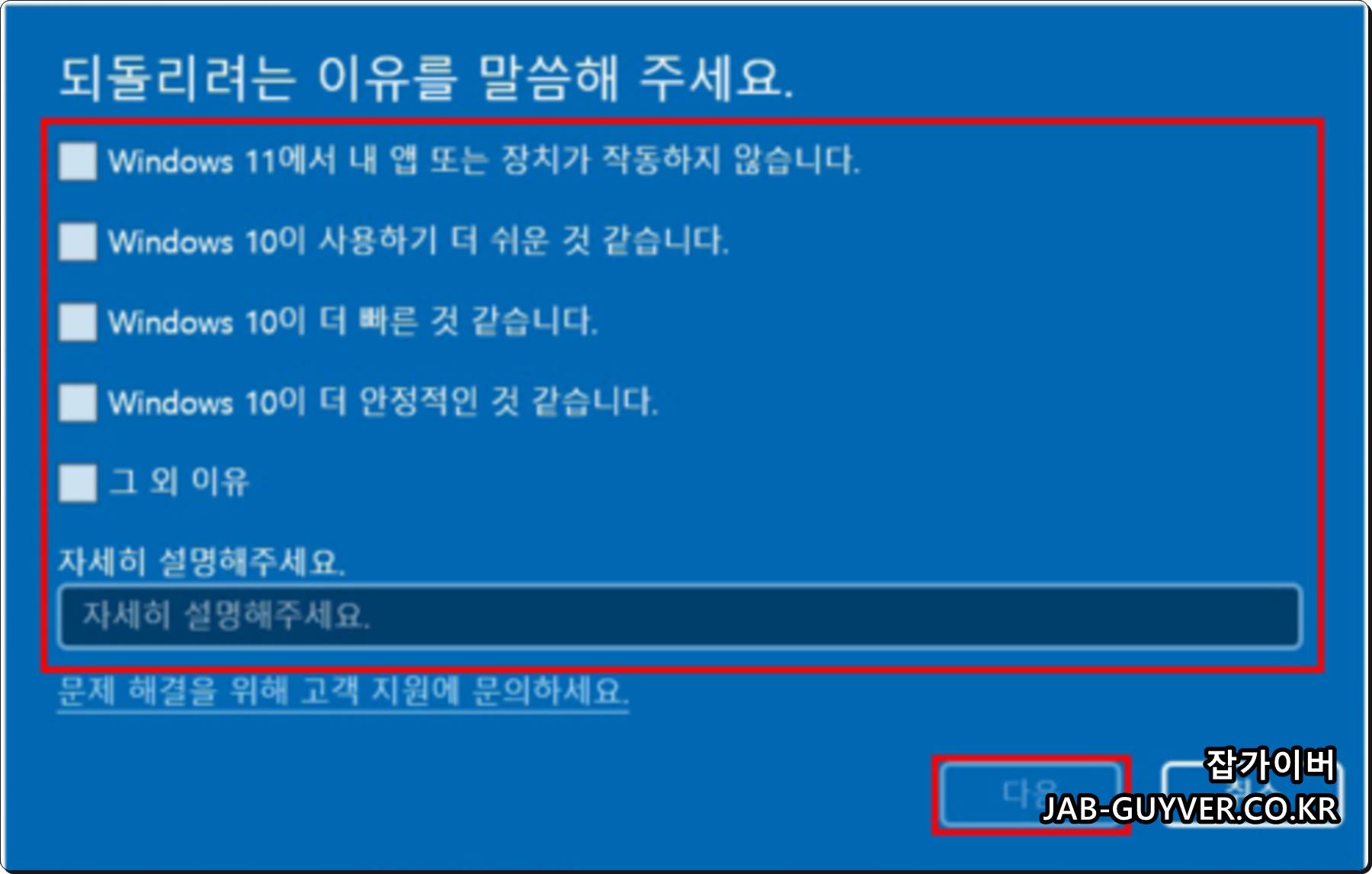 윈도우11에서 윈도우10 되돌리기 위해서는 되돌리는 이유를 아무거나 선택합니다.