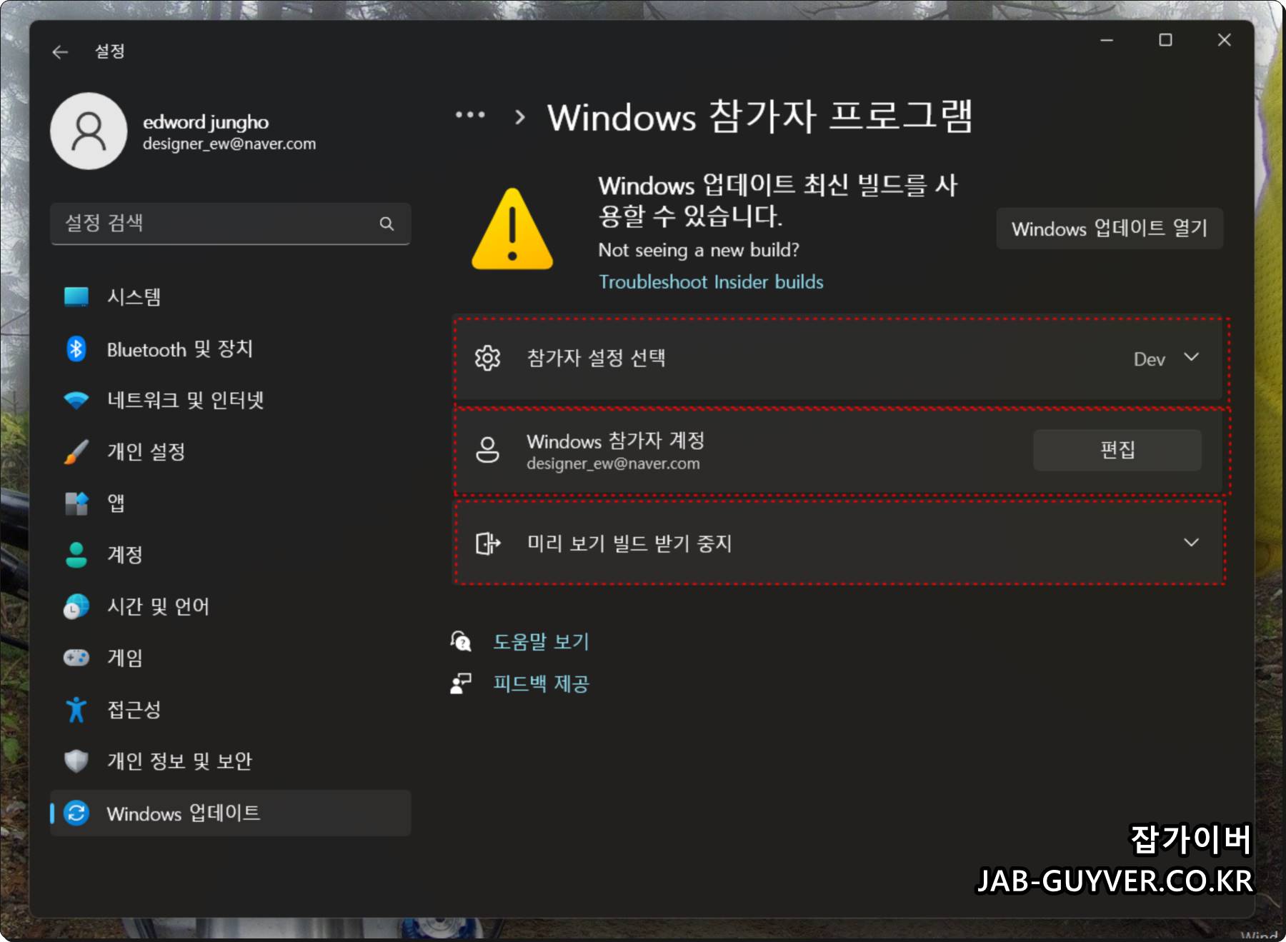 윈도우11 설정 -> 참가자 설정에서 미리보기 빌드받기 중지를 선택합니다.