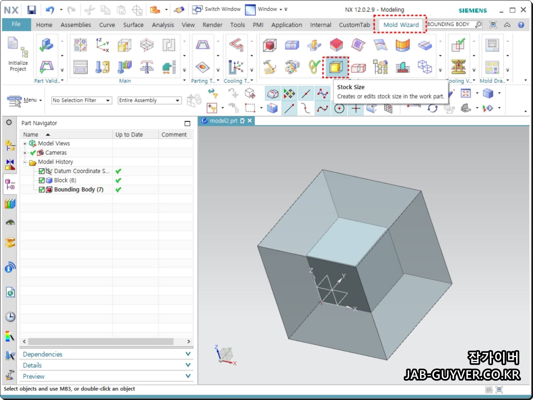 다른방법으로는 NX의 몰드위자드에서 제공하는 스톡사이즈 기능을 사용합니다.