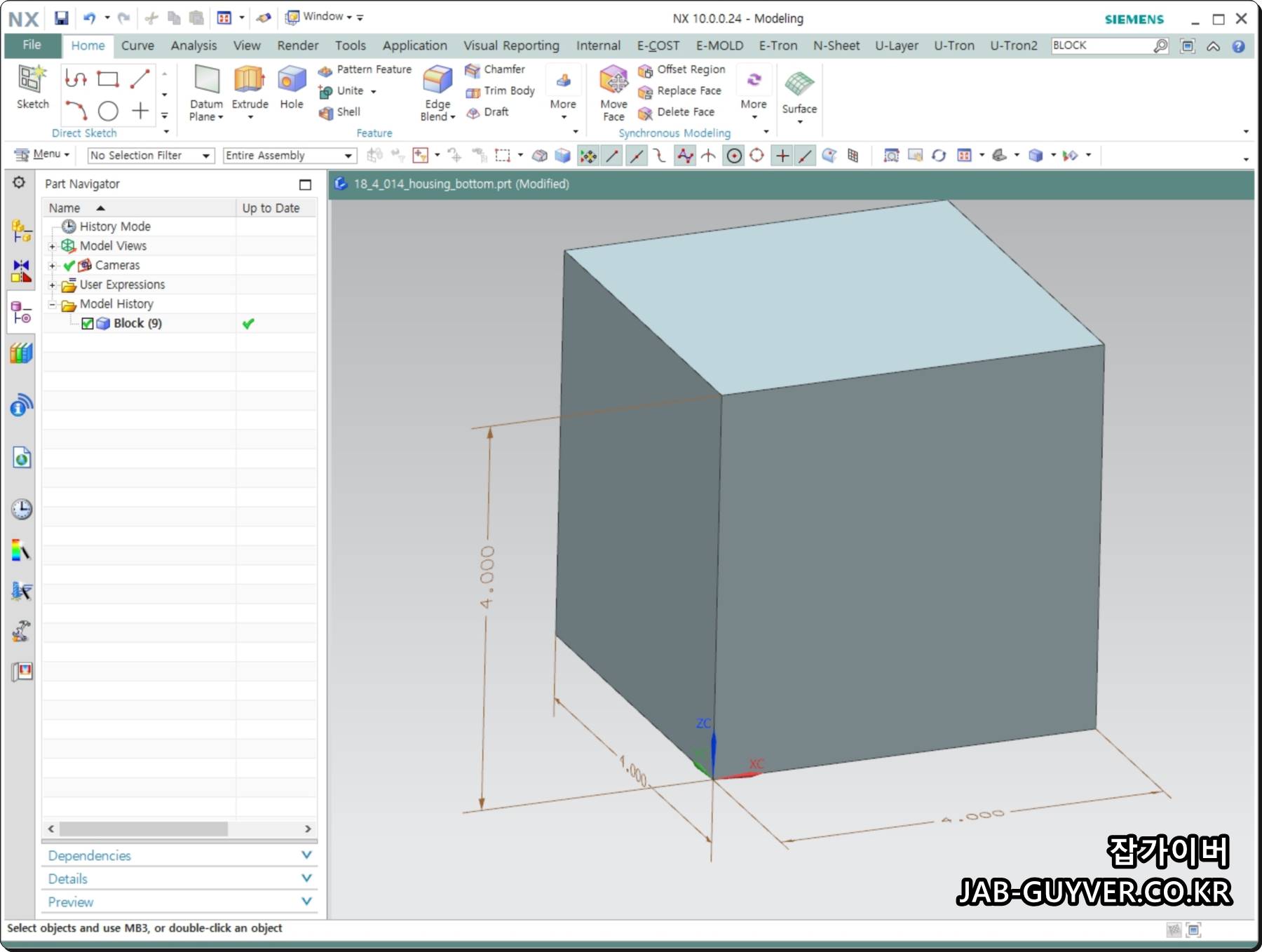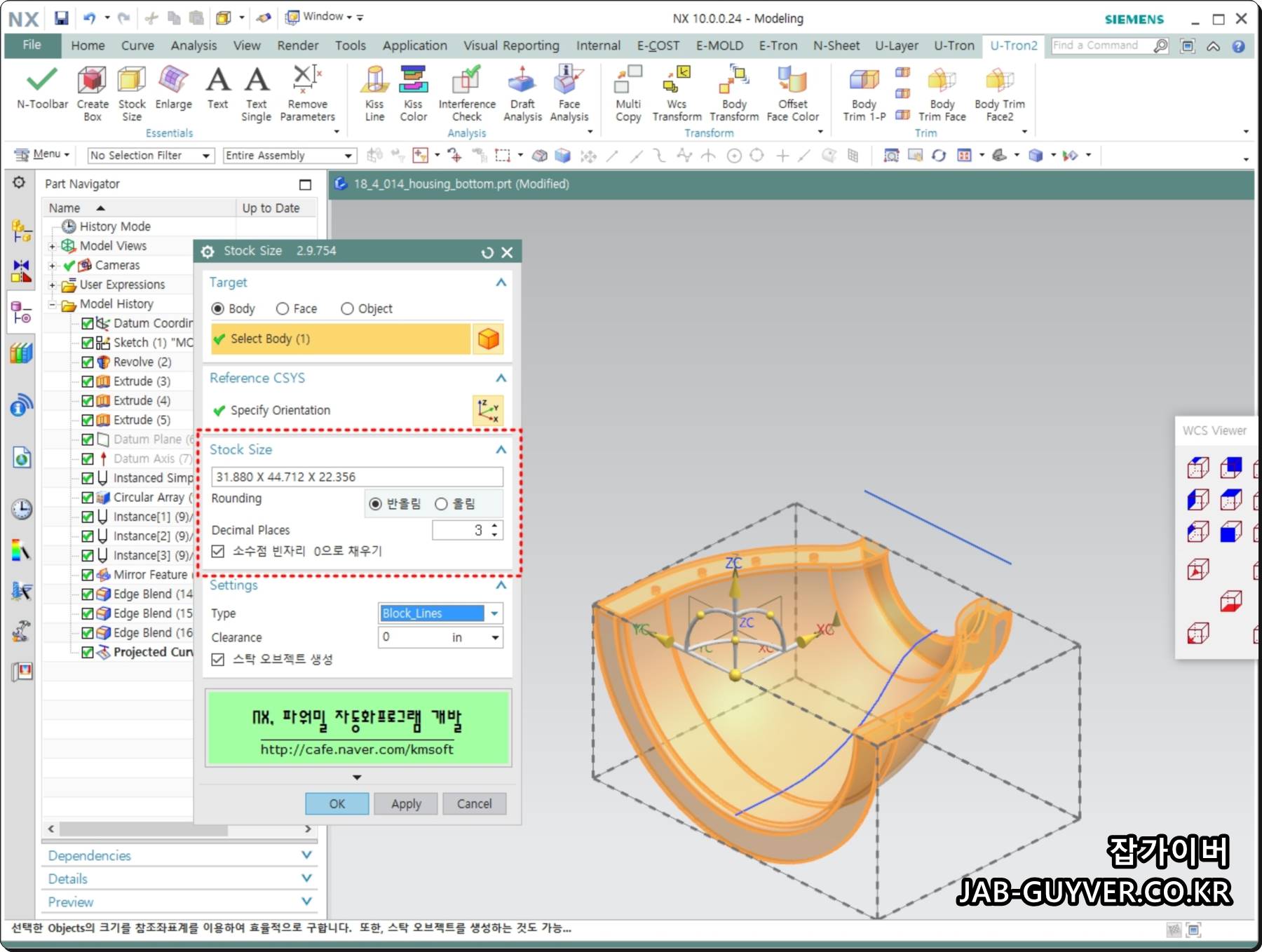 NX 몰드위자드 구입비용이 부담스럽다면 NX 파워밀 자동화프로그램인 울트론에서 제공하는 스톡사이즈 기능을 사용하면 사이즈를 측정할 수 있습니다.