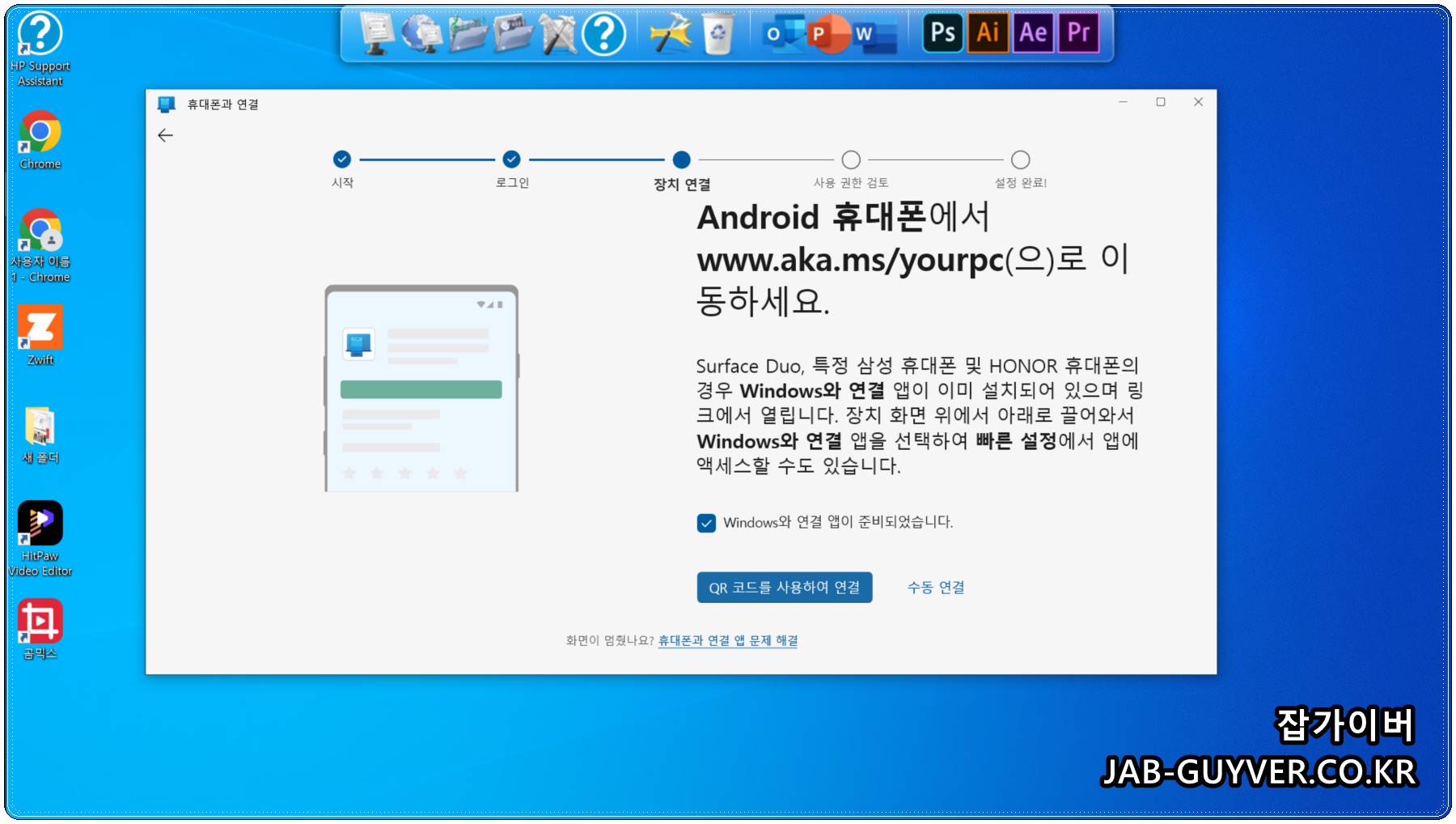 갤럭시 화면에서는 안내에 따라 www.aka.ms/yourpc 주소로 접속하거나, 핸드폰 링크 앱에서 표시된 QR코드를 카메라로 스캔하면 두 기기가 빠르게 이어집니다.