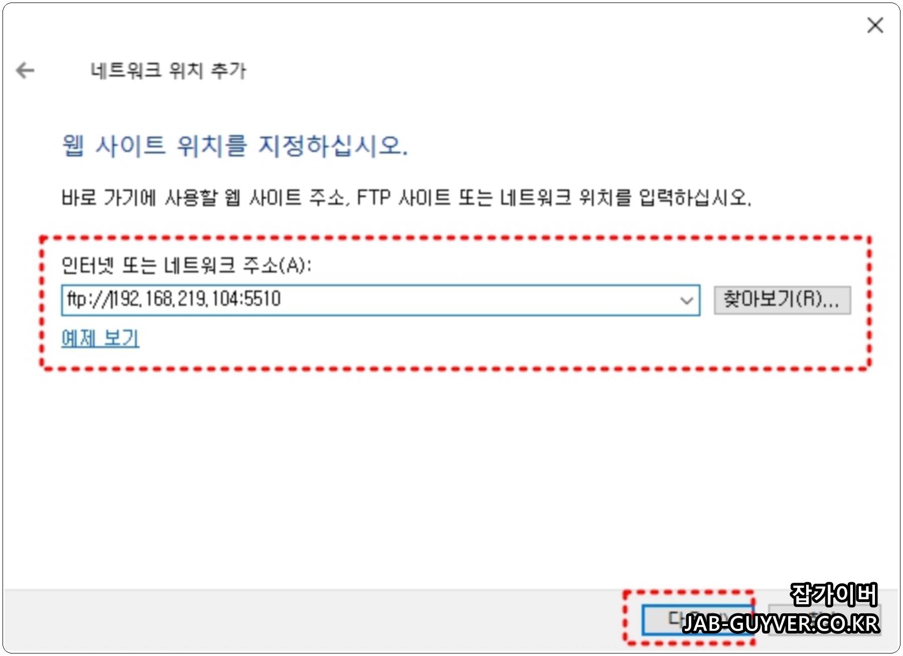 인터넷 또는 네트워크 주소에 FTP 주소를 입력해줍니다.