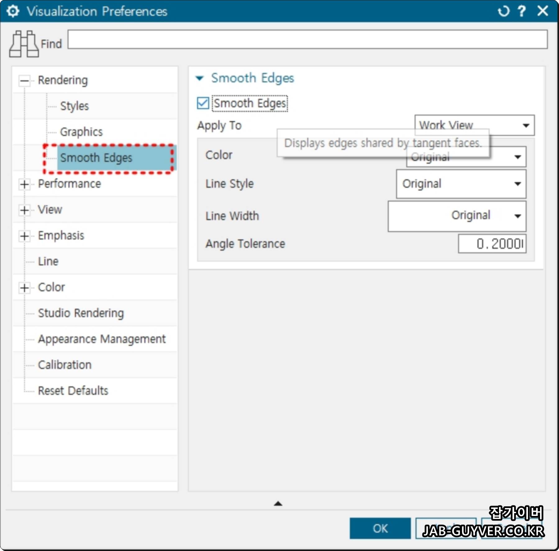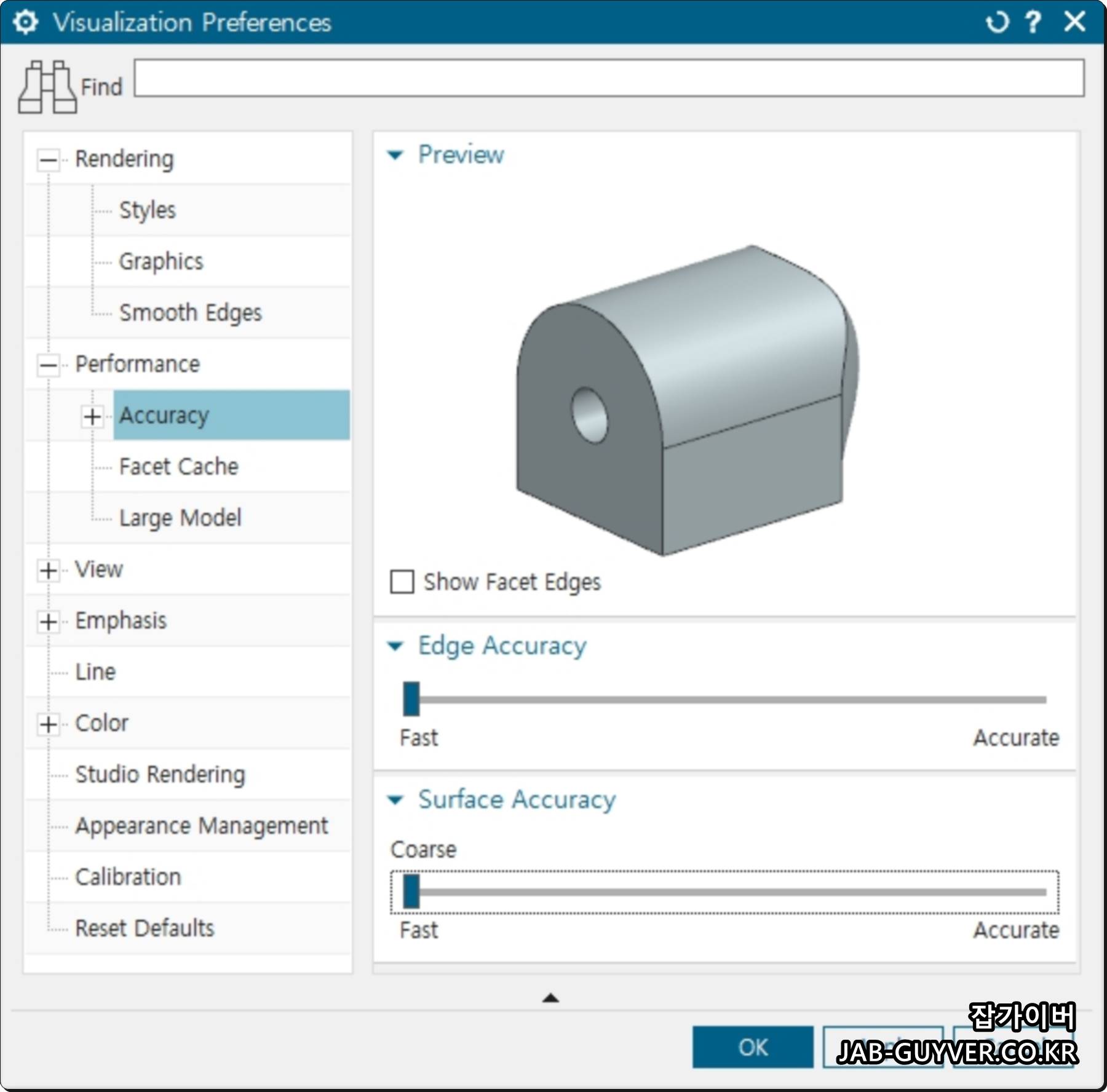그런데 간혹 설계 중 직선 커브 및 블랜드 r값등일 깨져 보이는 경우가 있다면 NX의 시각효과를 변경해줄 필요가 있습니다.