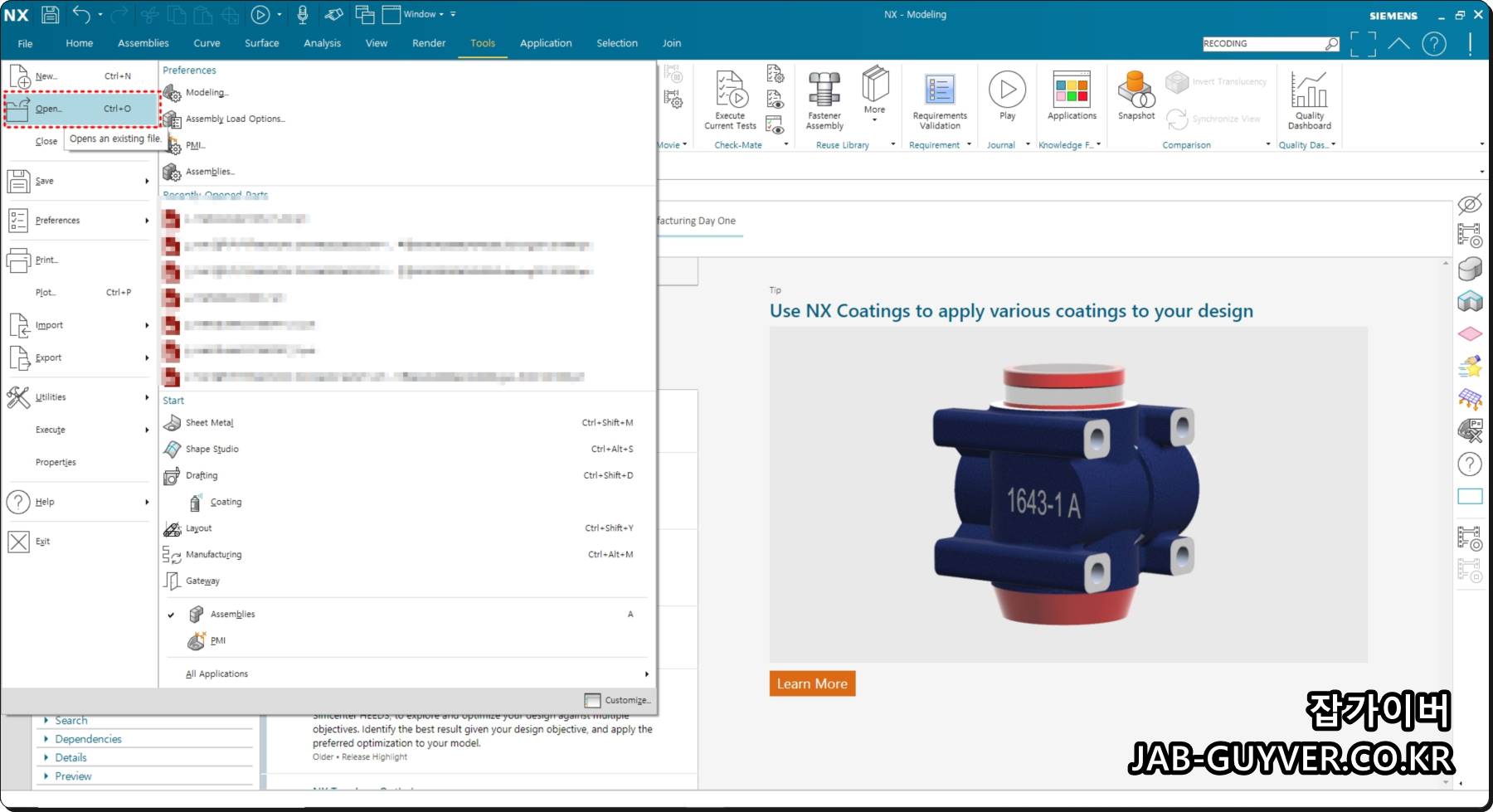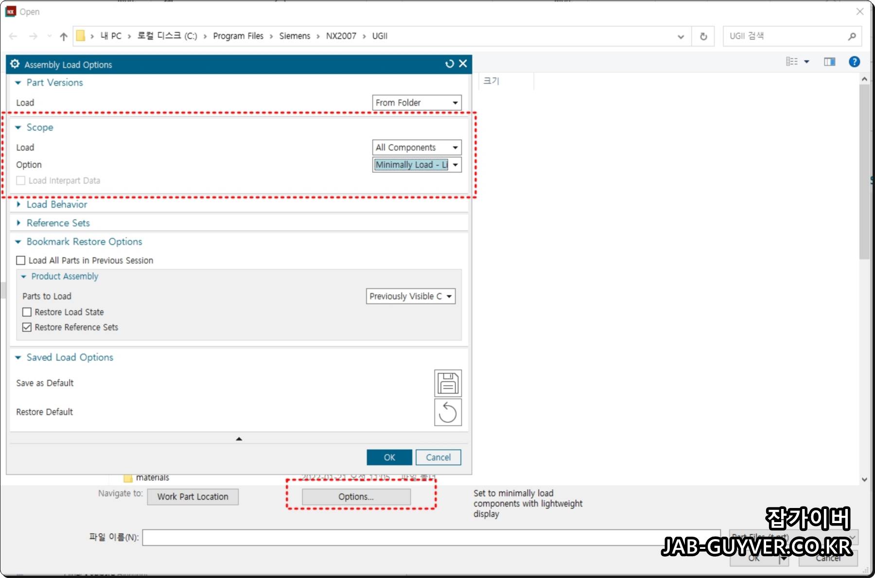 기본적으로 NX를 통해 파일을 불러올때 버벅거림을 방지하기 위해서는 파일열기 옵션을 설정해줍니다.