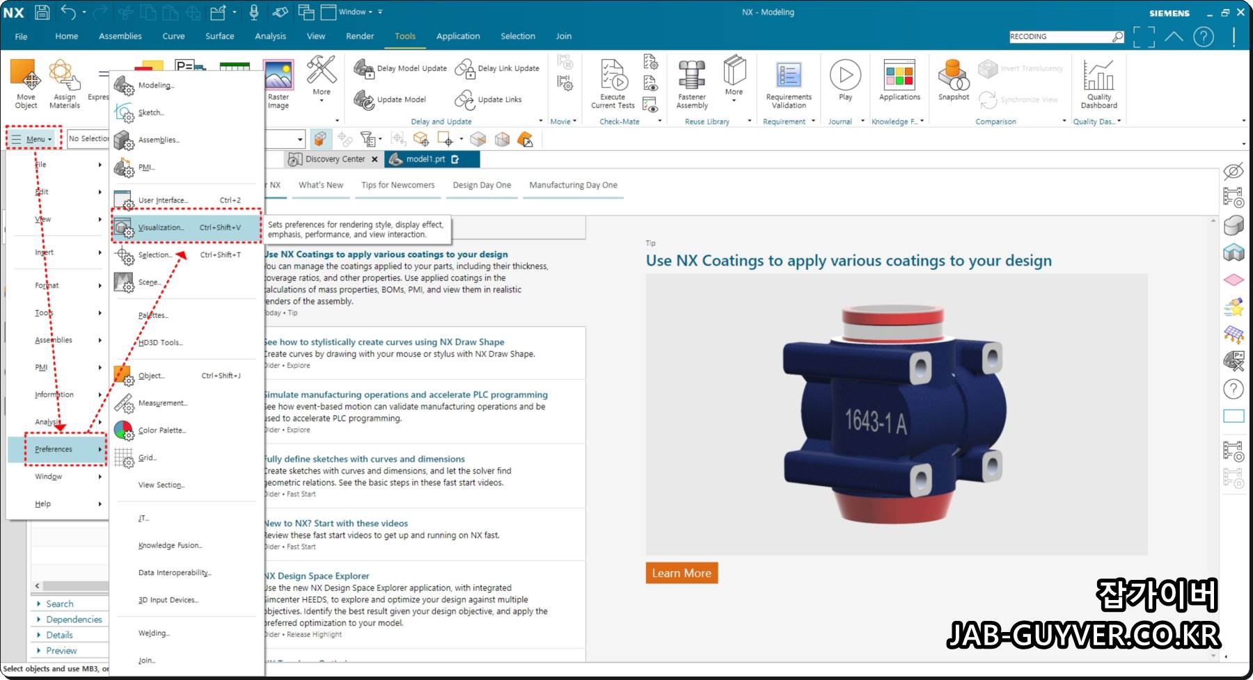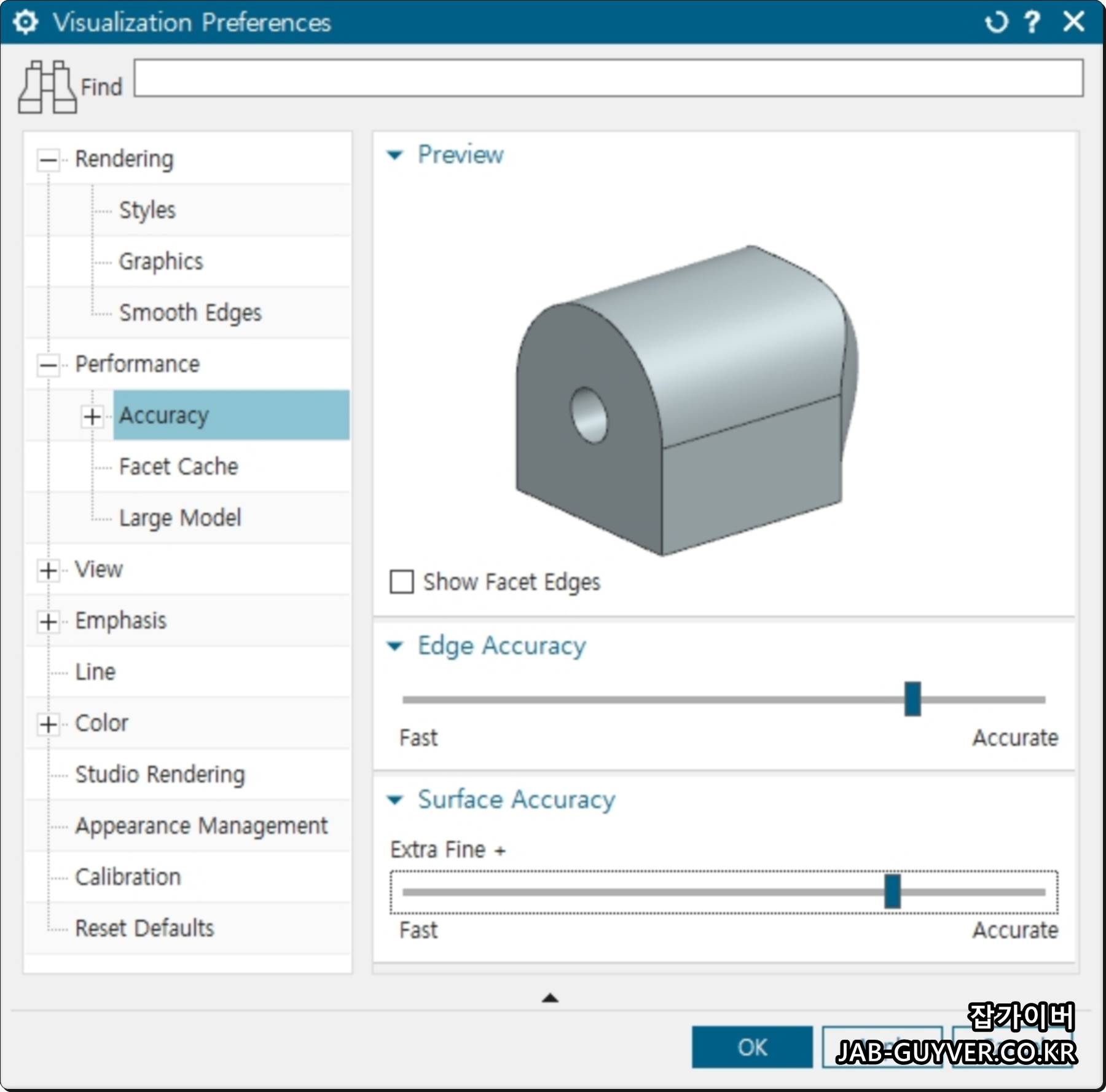 그런데 간혹 설계 중 직선 커브 및 블랜드 r값등일 깨져 보이는 경우가 있다면 NX의 시각효과를 변경해줄 필요가 있습니다.