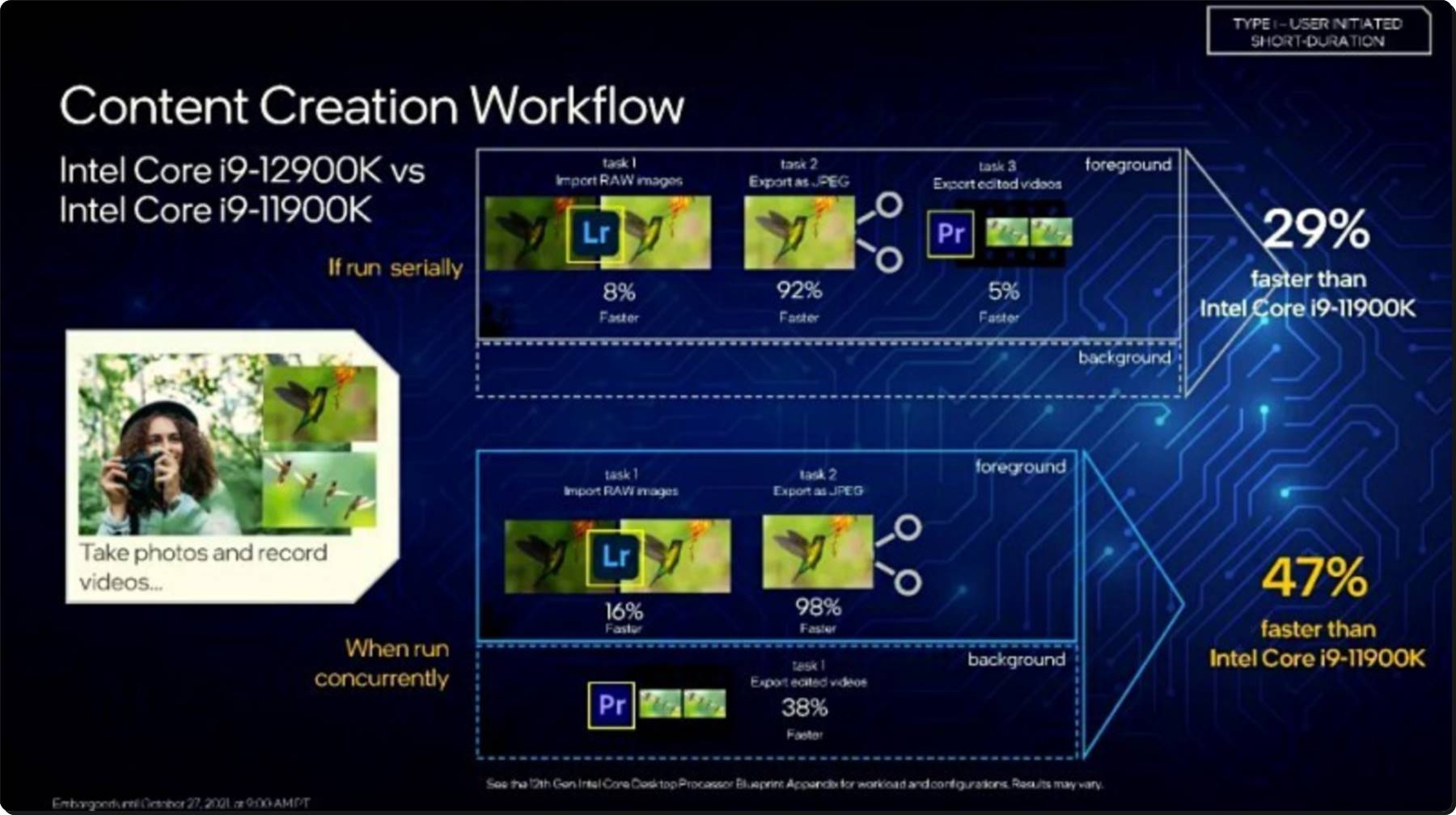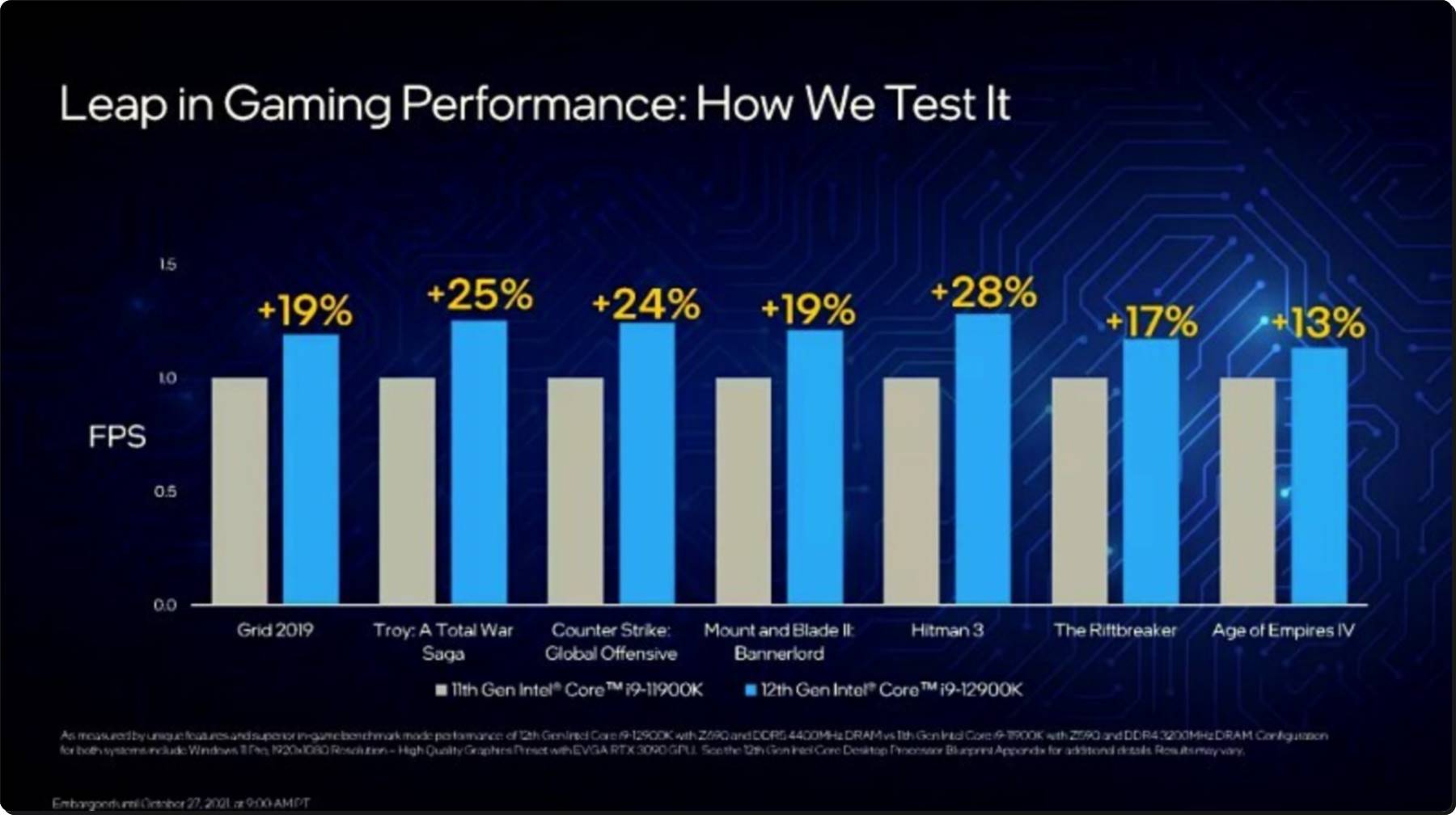 인텔 CPU는 윈도우11에서 DDR5-4400 메모리로 게임을 테스트했지만 DDR4 메모리 및 Windows 10과 비슷한 수준의 성능을 기대할 수 있다고 밝혔습니다. 인텔은 엘더레이크가 사용된 메모리 또는 OS 유형에 관계없이 라이젠에 대한 성능적 우위를 유지하고 있다고 합니다.