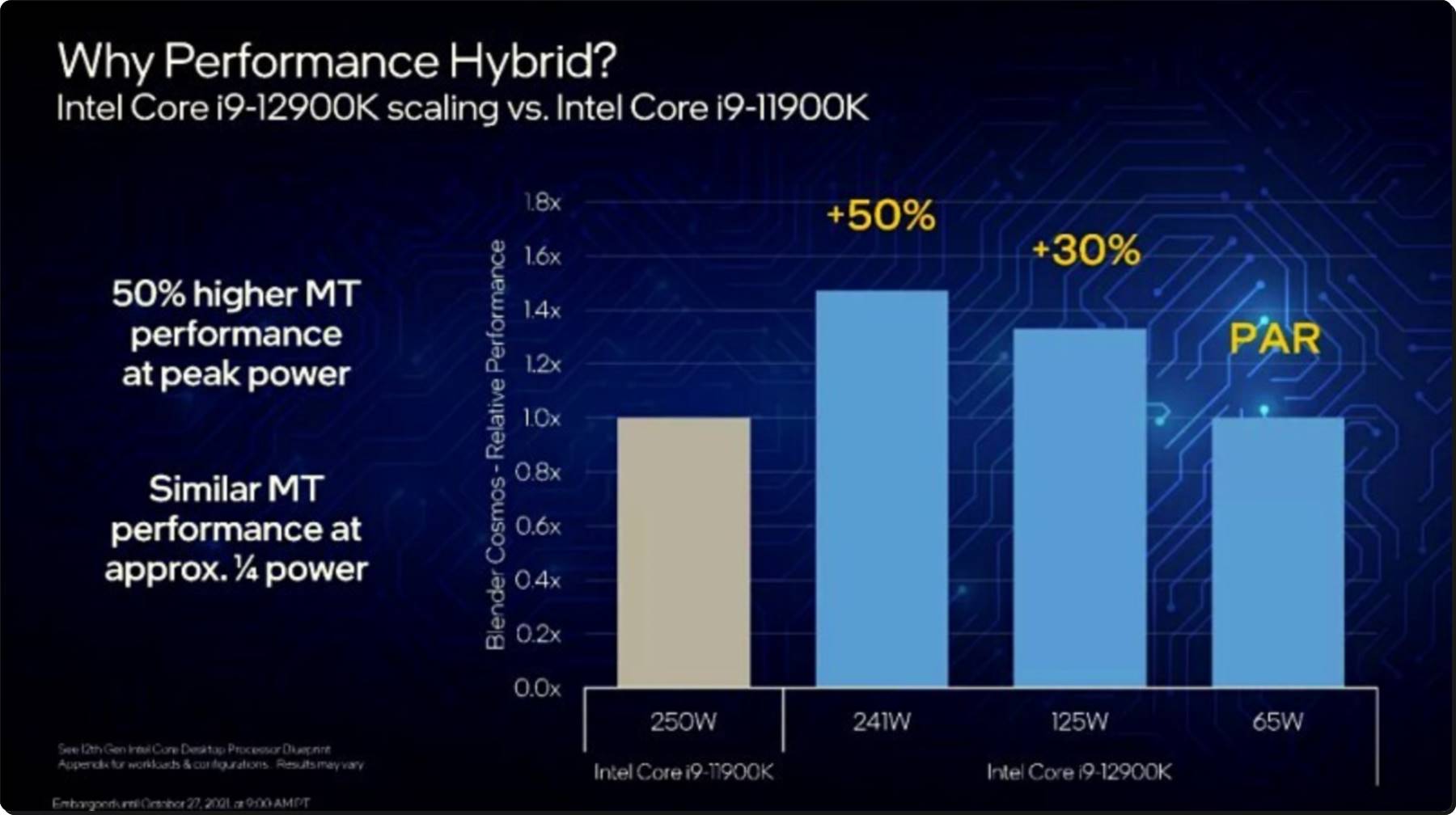 그 외 인텔은 히트맨3라고 하는 게임에서 앨더의 E-코어에서 물리학과 배경 작업을 지원하기 위해 최적화되어 있어 성능을 향상한다고 콕 집어 얘기하기도 했으며 게임 그래픽에서렌더링과 같은 지연에 민감한 작업이 P-코어에서 가장 잘 수행되는 반면 하이브리드 인식 엔진은 물리학이나 오디오와 같은 배경 작업을 E-코어에 섞을 수 있기 때문에 하이브리드 아키텍처의 최적화가 향후 더 많은 게임 타이틀로 필터링될 것으로 기대하고 있으며 하이브리드 아키텍처의 최적화는 다양할 수 있습니다. 예를 들어 마운트와 블레이드는 최상의 성능을 위해 모든 코어에서 실행되도록 최적화되었습니다.