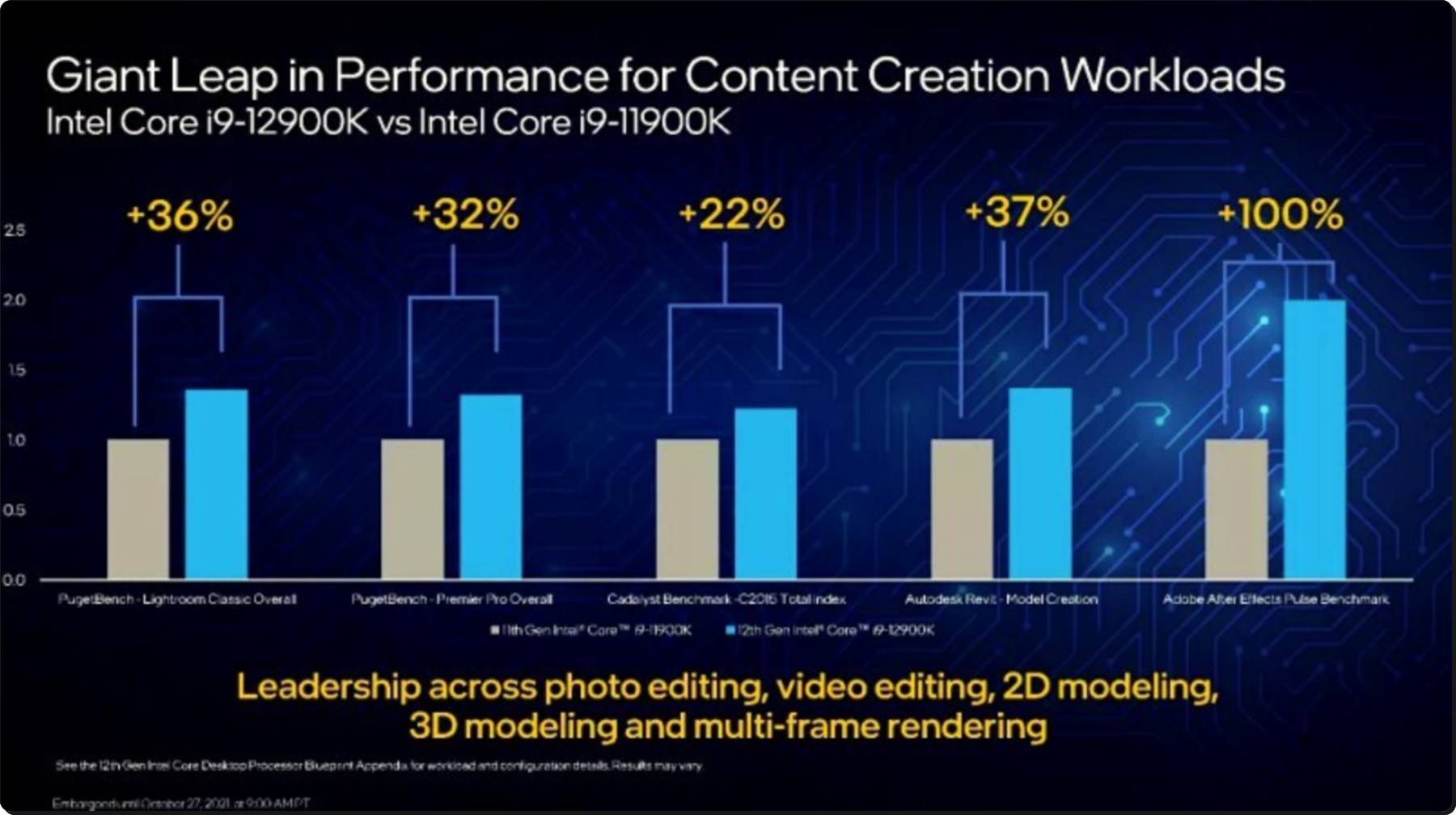 인텔이 '세계에서 가장 빠른 게임 프로세서'로 내세우는 플래그십 589달러의 코어 i9-12900K가 16개의 코어와 24개의 스레드로 주도하고 있습니다. 인텔은 이 칩이 게임 성능에서 평균 13%의 성능 향상을 제공하고, AMD의 Ryzen 9 5950X 플래그십을 게임에서 최대 30%까지 제치고, 콘텐츠 제작 작업량에서 이적 작의 최대 2배의 성능을 제공한다고 밝혔습니다.