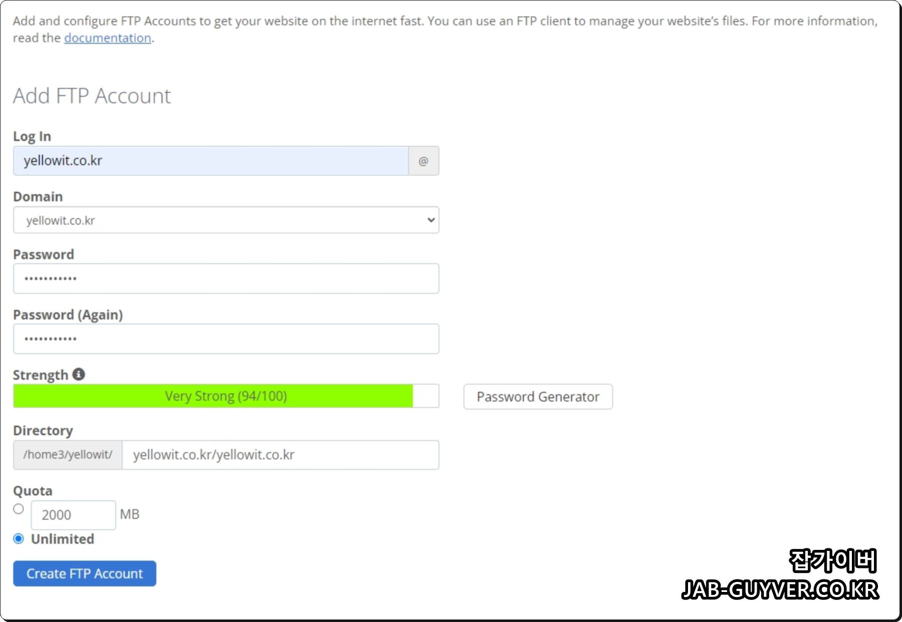 각각 선택 후 Create FTP Accout를 통해 FTP 계정을 만들어줍니다.