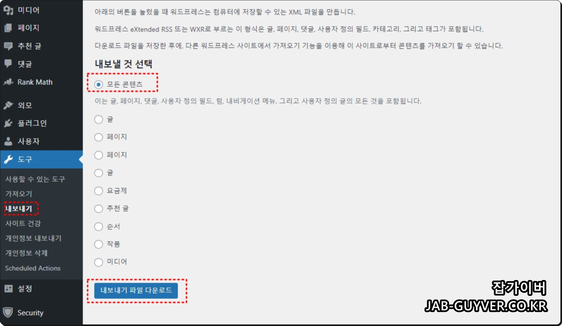 이 경우 백업된 파일은 XML 파일로 내보내기되고 추후 복구 및 워드프레스 이전 시 가져오기를 통해 내보낸 XML 데이터를 통해 마이그레이션이 가능합니다.