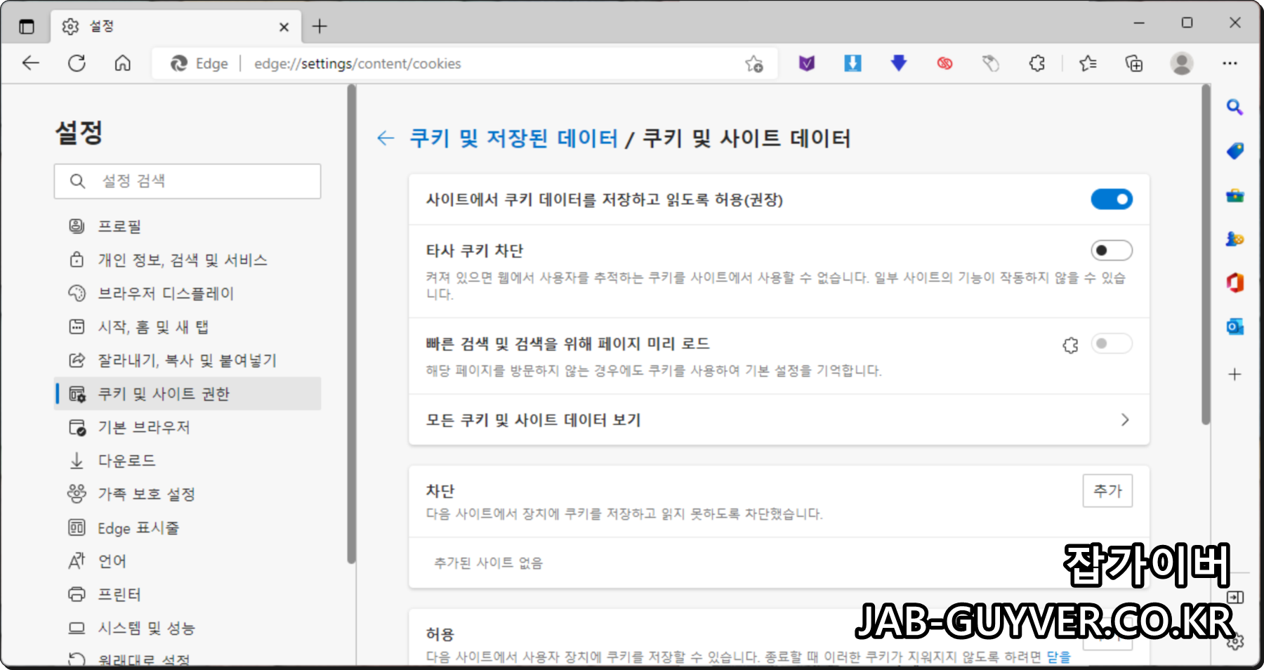 이후 사이트에서 쿠키 데이터를 저장하고 읽도록 권장하며 타사 쿠키등은 차단하느것이 좋습니다.